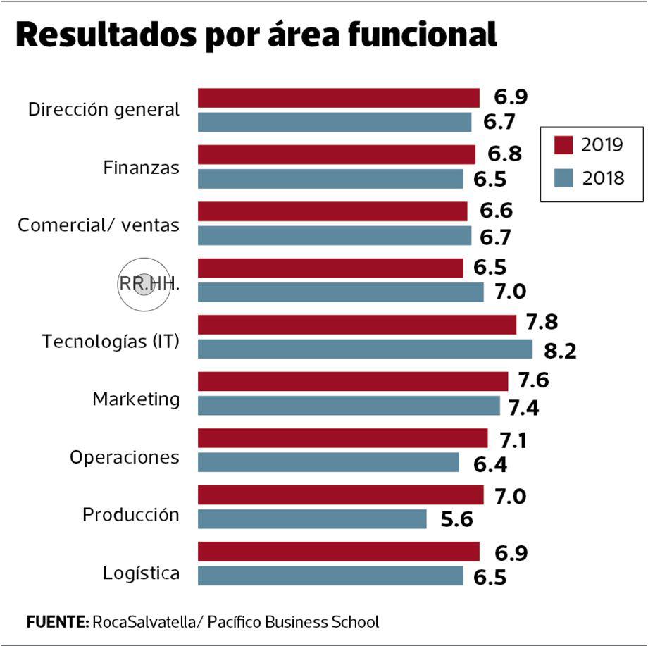 En segundo lugar aparecen los ejecutivos de la banca (7.5), seguidos por los de servicios (7.3), que mejoraron levemente frente al 2018. Por su parte, los resultados más bajos corresponden a construcción, retail y comercio.