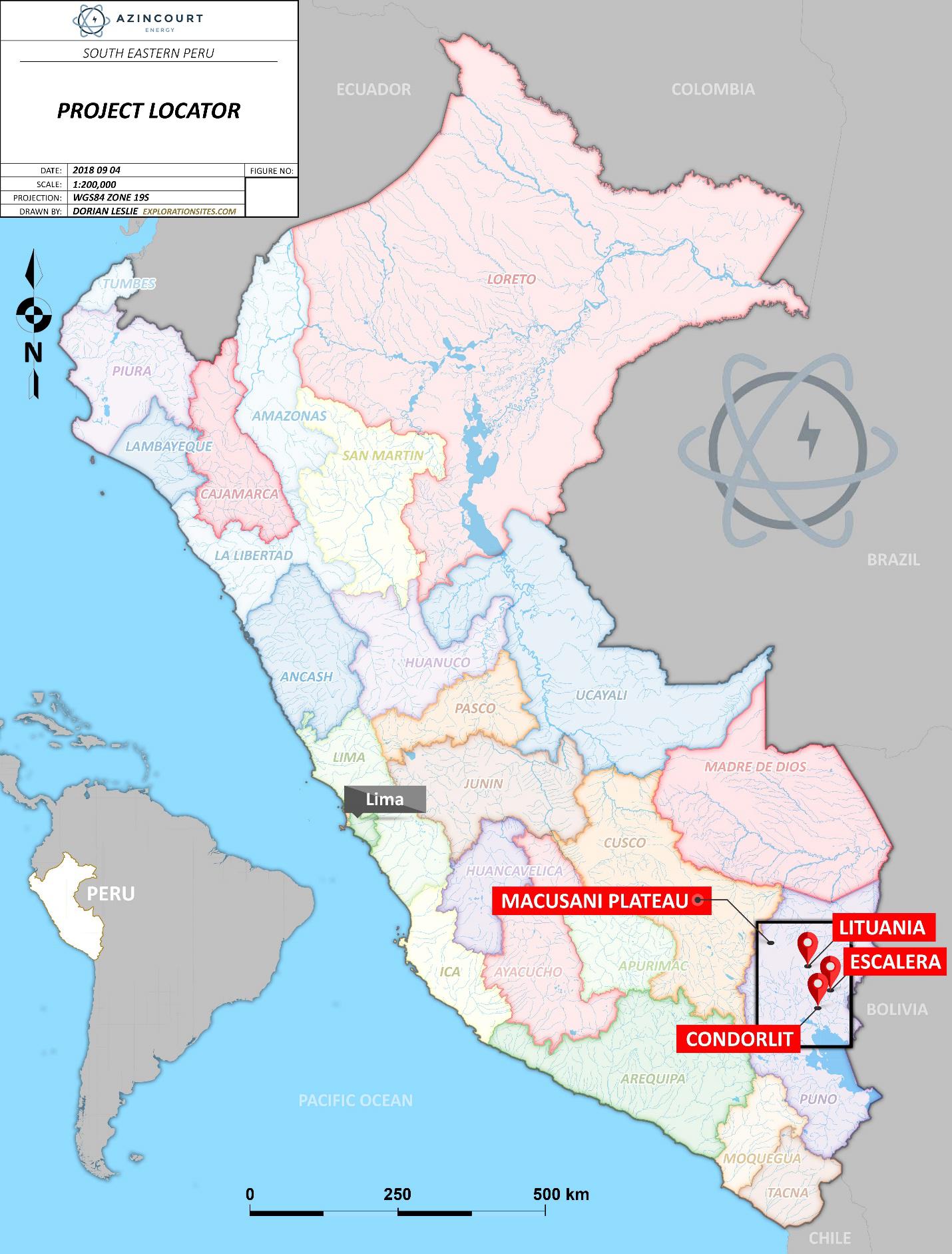 Las viviendas de Azincourt, conocidas como el Proyecto Escalera-Lituania-Condorlit, cubren un área combinada de 7,400 hectáreas de objetivos de exploración para uranio supergénico / superficial alojado volcánicamente y litio en la meseta de Picotani.