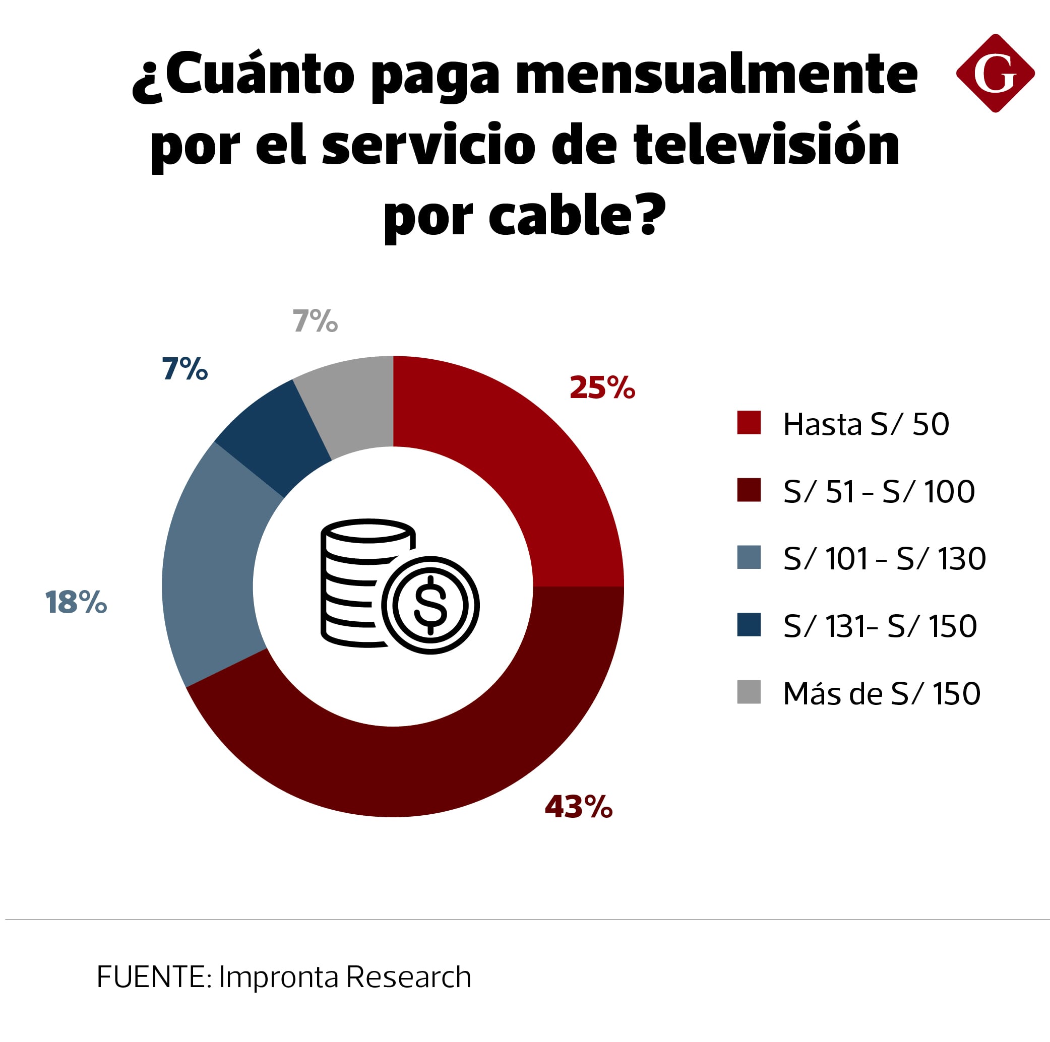 A nivel de costos, un 68% de aquellos que cuentan con televisión por cable, está dispuesto a pagar como máximo S/ 100 mensual por este servicio; en tanto, un 25% entre S/ 100 y S/ 150; y solo un 7% más de S/ 150.