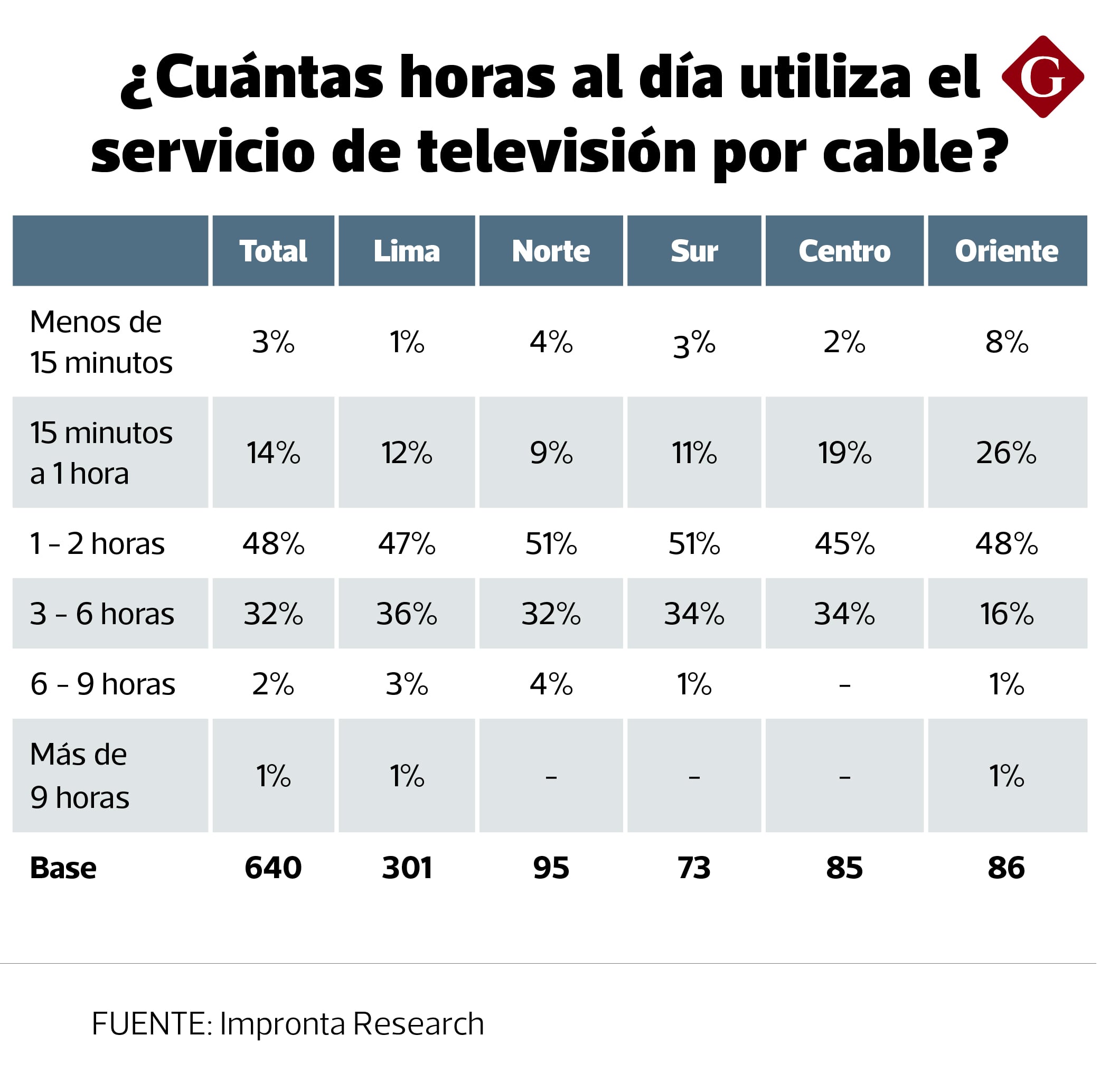 De acuerdo a un estudio elaborado por Impronta Research, existe un 64% de peruanos que cuentan con el servicio de televisión por cable, principalmente, mayores de 36 años del nivel socioeconómico A y B que radican en Lima y la zona norte del país.