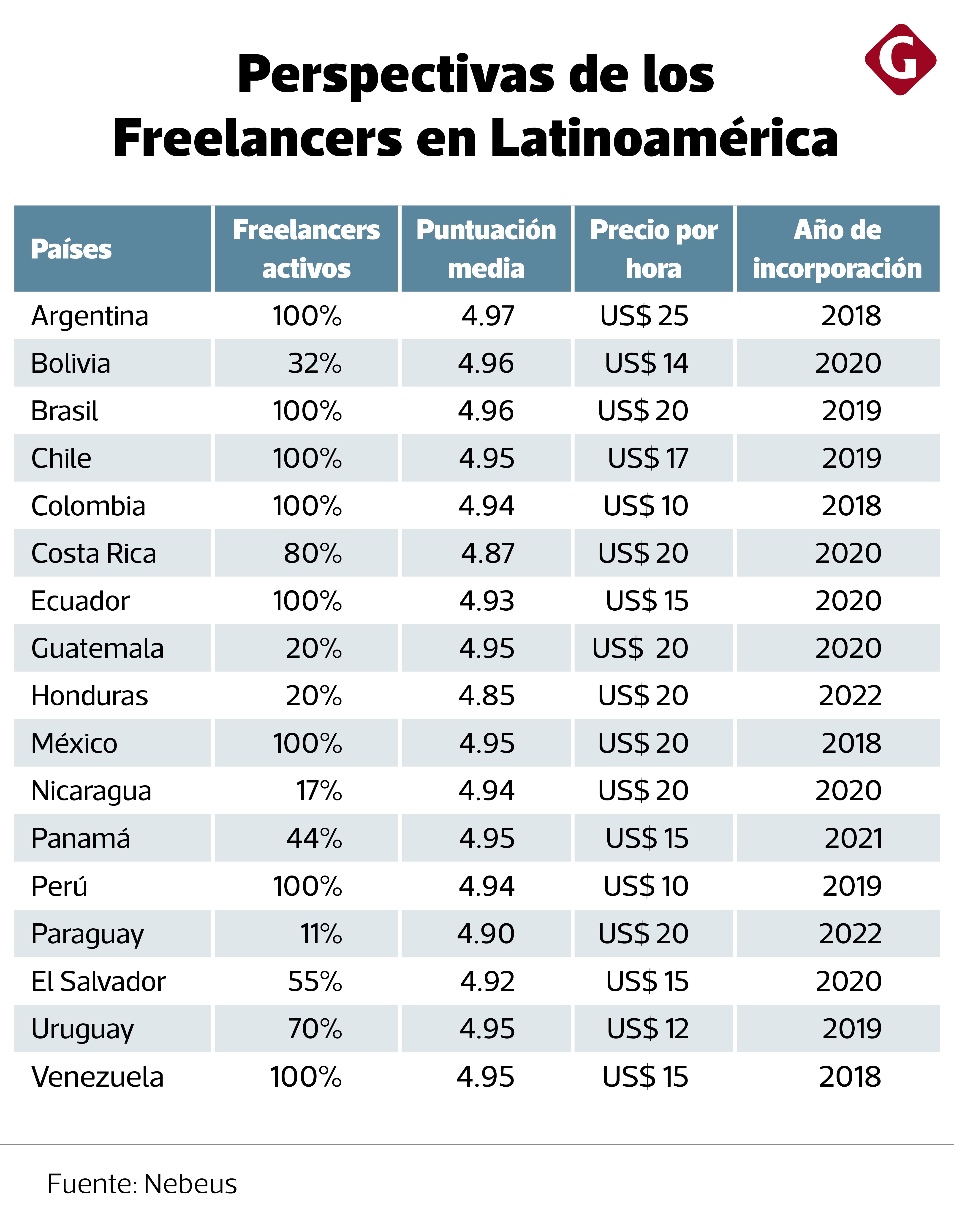 En detalle, los freelancers peruanos cobran en promedio US$ 10 la hora, siendo la tarifa más económica de la región, al igual que Colombia (US$ 10). Sin embargo, son los que mejores calificaciones tienen por parte de sus clientes con una puntuación de 4.94 de 5. Además de ello, son de los pocos países con mayor actividad en América Latina.