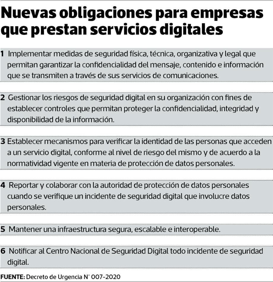 Como informó Gestión (10.01.2020), el Estado ha emitido un decreto de urgencia que crea seis nuevas obligaciones para las empresas que prestan servicios digitales (ver tabla).