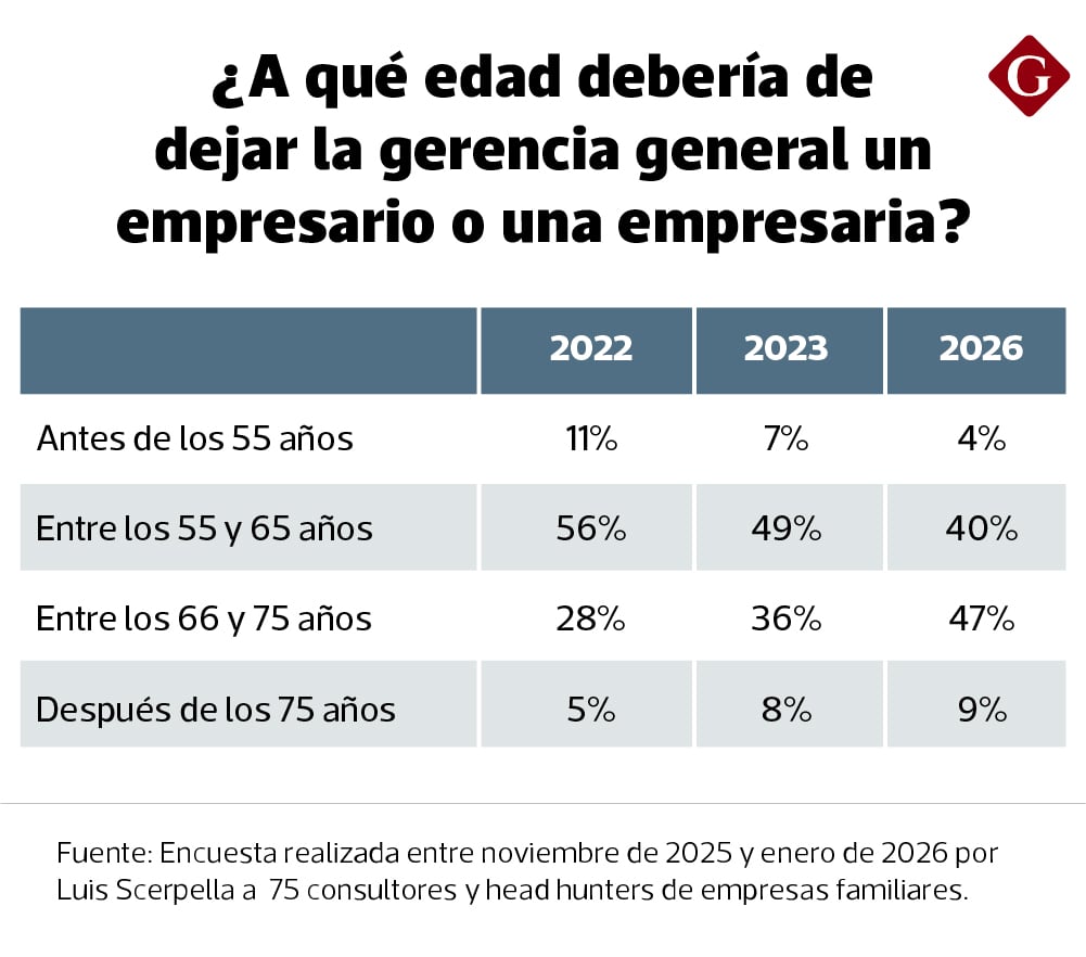Según la encuesta elaborada por el consultor de empresas familiares a 75 profesionales —entre consultores, empresarios y head hunters— revela que el 47% considera que la salida del gerente general debería producirse entre los 66 y 75 años, convirtiéndose esta franja etaria en la alternativa con mayor respaldo.
