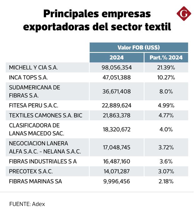 Según cifras de Adex, Michell y Cía se posiciona como el principal actor de la industria textil en Perú, pese a registrar una contracción de 4.1% en sus exportaciones durante el 2024. Su principal producto es el pelo fino de alpaca peinado y su mercado más relevante es China.