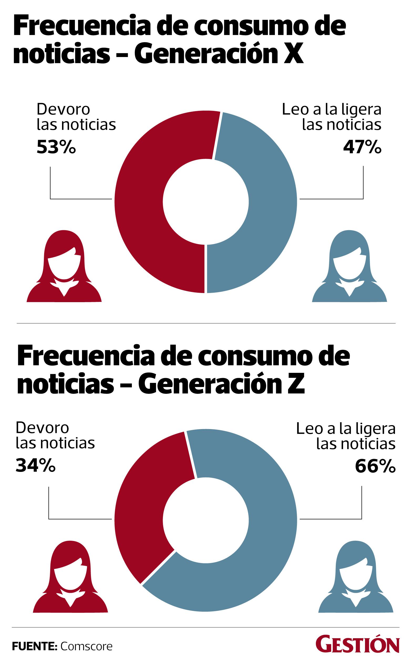 Asimismo, el 53% de encuestados pertenecientes a la generación millennial dijo que ‘devora las noticias’ (leerlas con detenimiento y profundidad, no sólo los títulos a la ligera). Sin embargo, la generación Z se encuentra mucho menos enganchada, el 66% admite solo leer las noticias ligeras.