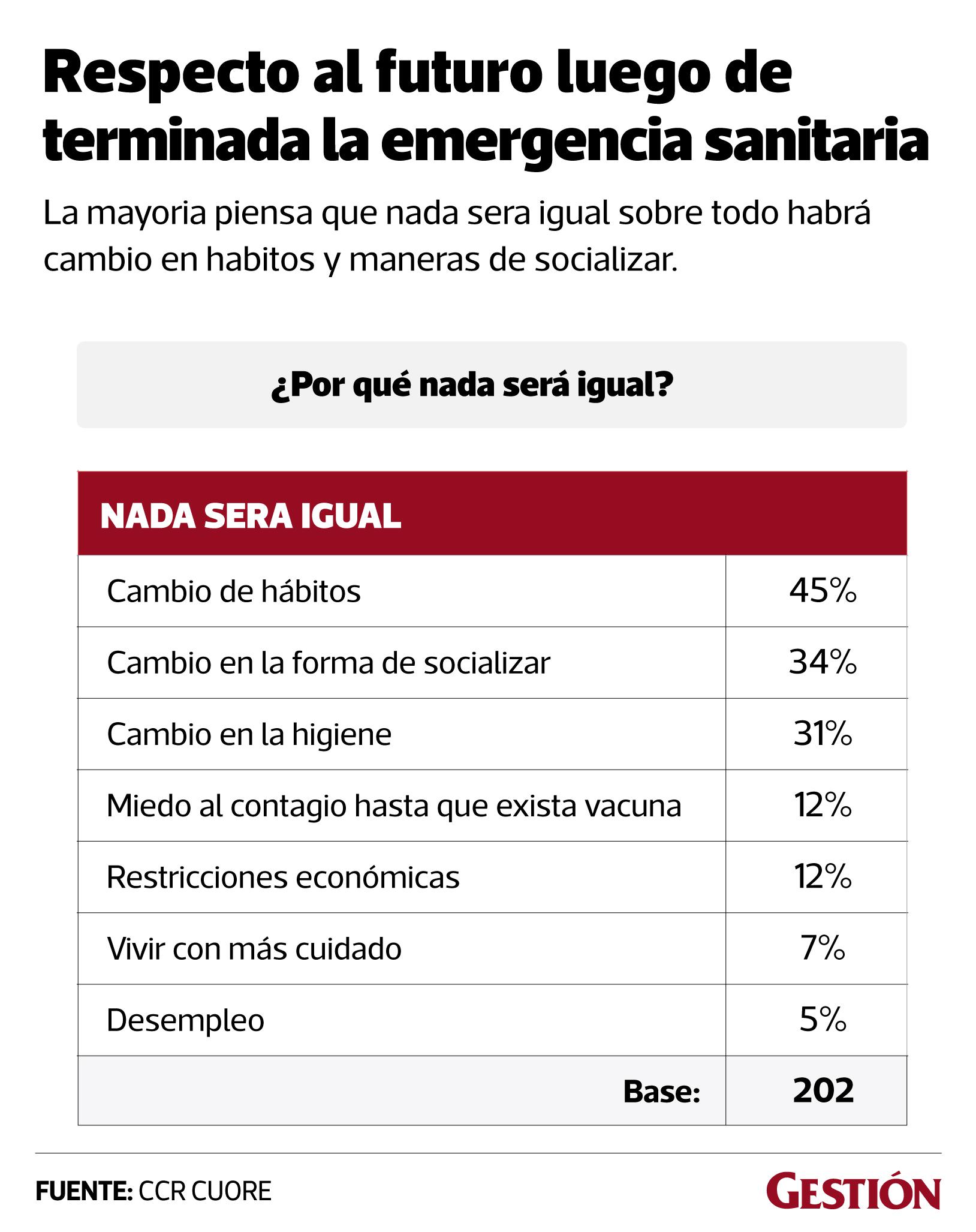 Respecto a porqué las cosas no se mantendrán igual, el 45% señala que esto se deberá a un cambio de hábitos, el 34% proyecta modificaciones en la forma de socializar, el 31% en cambios de higiene, entre otros.