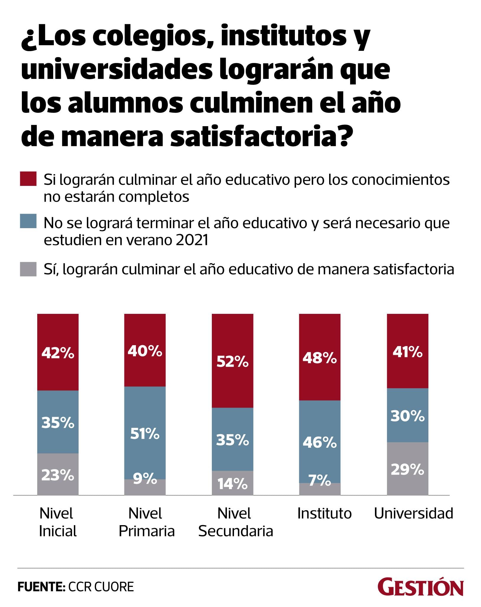 Según datos de la consultora, la mayoría cree que la educación de este año no estará completa; así un 51% de padres con hijos en nivel primario considera que será necesario estudiar en verano 2021; así también lo considera el 35% que tienen hijos en secundaria, y 35% en educación inicial.