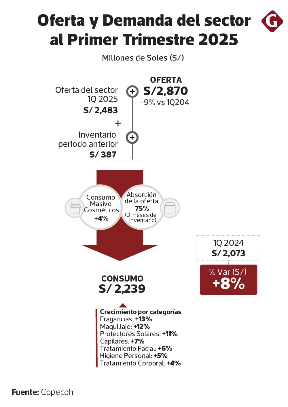 Acevedo detalló que el consolidado de oferta (importaciones, producción nacional e inventarios) alcanzó los S/ 2,870 millones. Sin embargo, al considerar que el 75% de esta oferta corresponde a un inventario de aproximadamente tres meses, y sumando el efecto del consumo masivo, el consumo final efectivo se ubicó en S/ 2,239 millones. Esto representa un avance real de 8% respecto al mismo periodo del año anterior.