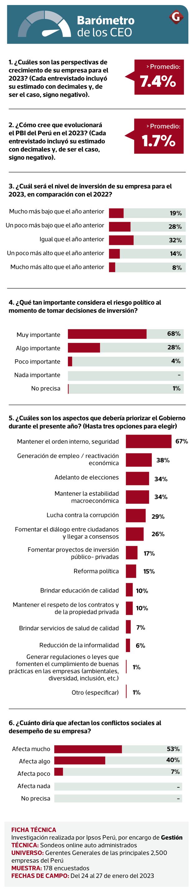 El barómetro, que será presentado por Gestión e Ipsos Perú todos los meses, también muestra en esta primera edición que los gerentes general estiman que sus empresas crecerán muy por encima de las proyecciones de expansión del PBI en el 2023: 7.4% frente a 1.7%.