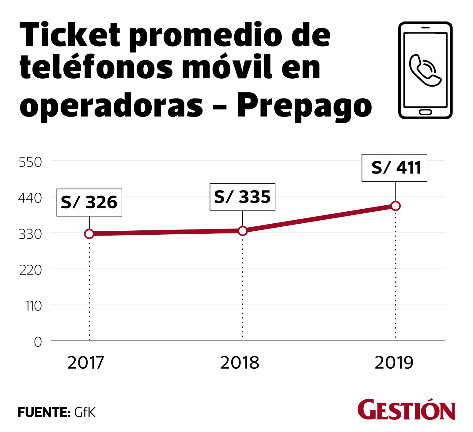 Así el ticket promedio de un equipo postpago comprado en el canal retail a través de los operadores móviles pasó de S/ 170 en el 2017 a S/ 219 en el 2019, un incremento de S/ 49. Mientras que en cuanto al ticket promedio de un equipo prepago comprado en el canal retail, este pasó de S/ 326 en el 2017 a S/ 411 en el 2019.