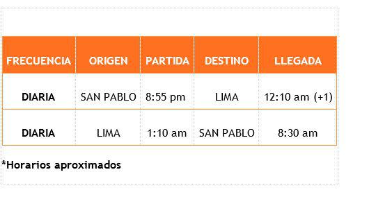 La nueva ruta tiene una duración promedio de 5 horas y 20 minutos. El viaje (vuelo G3 7620) llega (hoy) a Lima a la 12:10 AM (hora local) ya que sale de San Paulo a las 8:55 pm. El regreso (vuelo G3 7619) comienza a las 1:10 AM y aterrizará a las 8:30 AM en el aeropuerto internacional São Paulo-Guarulhos.