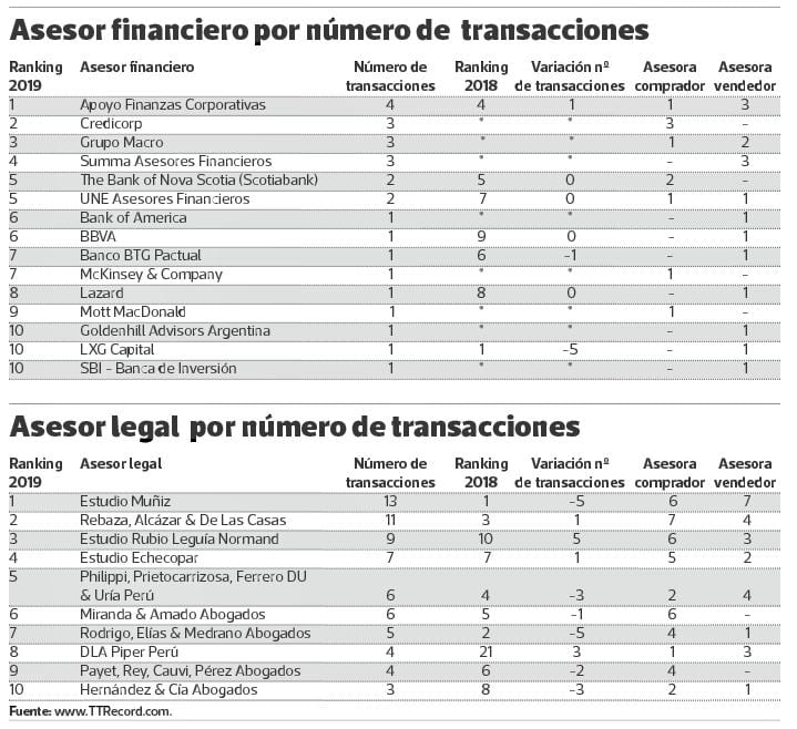 En los primeros ocho meses del año, según TTR, se han cerrado 81 operaciones en el país, lo que implica un descenso por número de transacciones de un 22.86%, en relación al mismo periodo del año pasado; en el caso de monto movilizado, la caída fue mayor: 53%, ya que el capital que se reportó entre enero y agosto fue de US$ 2,407 millones.