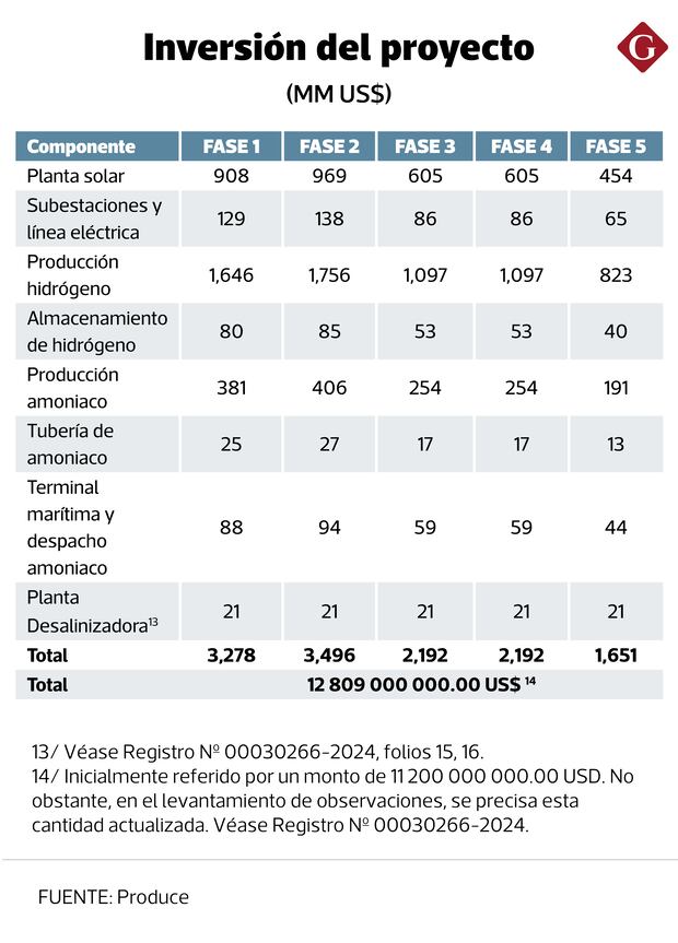 En tanto, en la fase 2 y 3, de estará orientando unos US$2,192 millones en cada etapa, mientras que en la última parte del proyecto de hidrógeno verde (fase 5), se tiene previsto una inversión de US$1,651 millones.