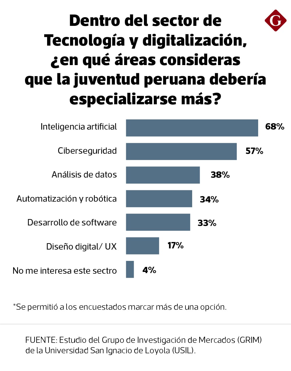 Dentro del sector tecnológico, las áreas donde los jóvenes consideran más importante especializarse son inteligencia artificial (68%), ciberseguridad (57%) y análisis de datos (38%).