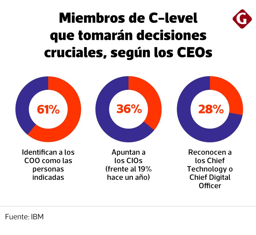 El 61% de CEO señala a los Chief Operating Officer (COO) y el 55% a los Chief Financial Officer (CFO) como los miembros de C-level que tomarán las decisiones más cruciales en los próximos tres años. El 36% apunta al Chief Information Officer (CIO), frente al 19% hace un año, seguido del Chief Technology o Chief Digital Officer (28%).