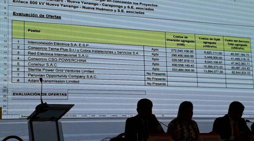 La Agencia de Promoción de la Inversión Privada (ProInversión) adjudicó hoy a Interconexión Eléctrica SA, del Grupo ISA de Colombia, la concesión de las líneas de transmisión eléctrica "enlace 500kV Mantaro-Nueva Yanango- Carapongo y Subestaciones Asociadas' y 'enlace 500kV Nueva Yanango-Nueva Huánuco y Subestaciones Asociadas'.