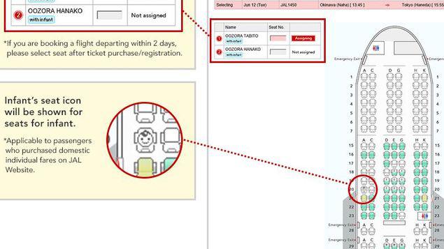 Los mapas de JAL indican dónde están sentados los niños menores de dos años con un ícono infantil para que “otros pasajeros lo sepan”.
