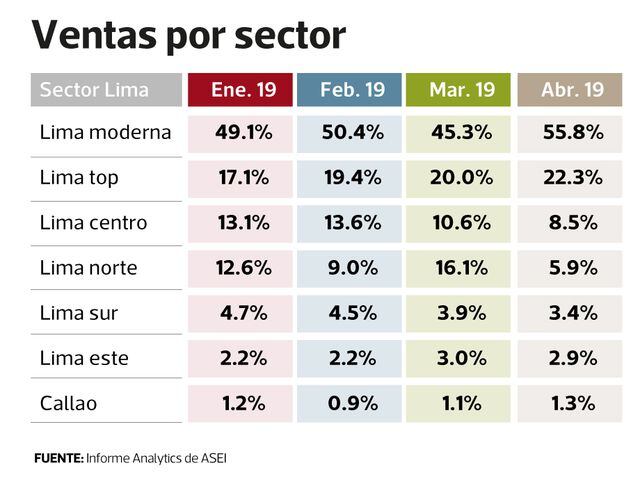 En el caso del sector Lima Moderna, la participación de vivienda nuevas vendidas tiene un 55% de presencia, a abril de este año. Este sector comprende los distritos de Jesús María, Barranco y Lince, entre otros.