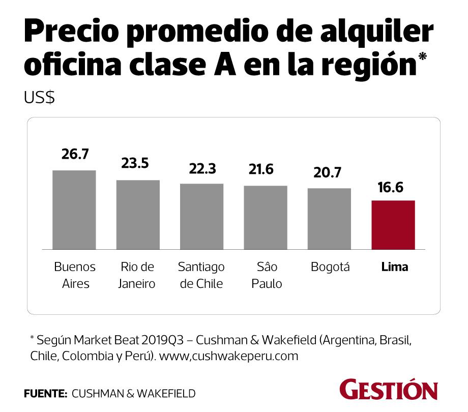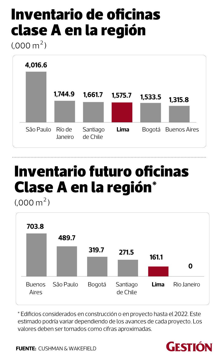 Si bien Sao Paulo y Río de Janerio son las ciudades que mantienen el liderazgo en cuanto a superficie arrendable dentro de la región; Lima, junto a Santiago de Chile y Bogotá mantienen un inventario para oficinas prime o conocidas como de Clase A que supera el millón y medio de metros cuadrados. Y este continuará en crecimiento, según el último reporte de la consultora Cushman & Wakefield.