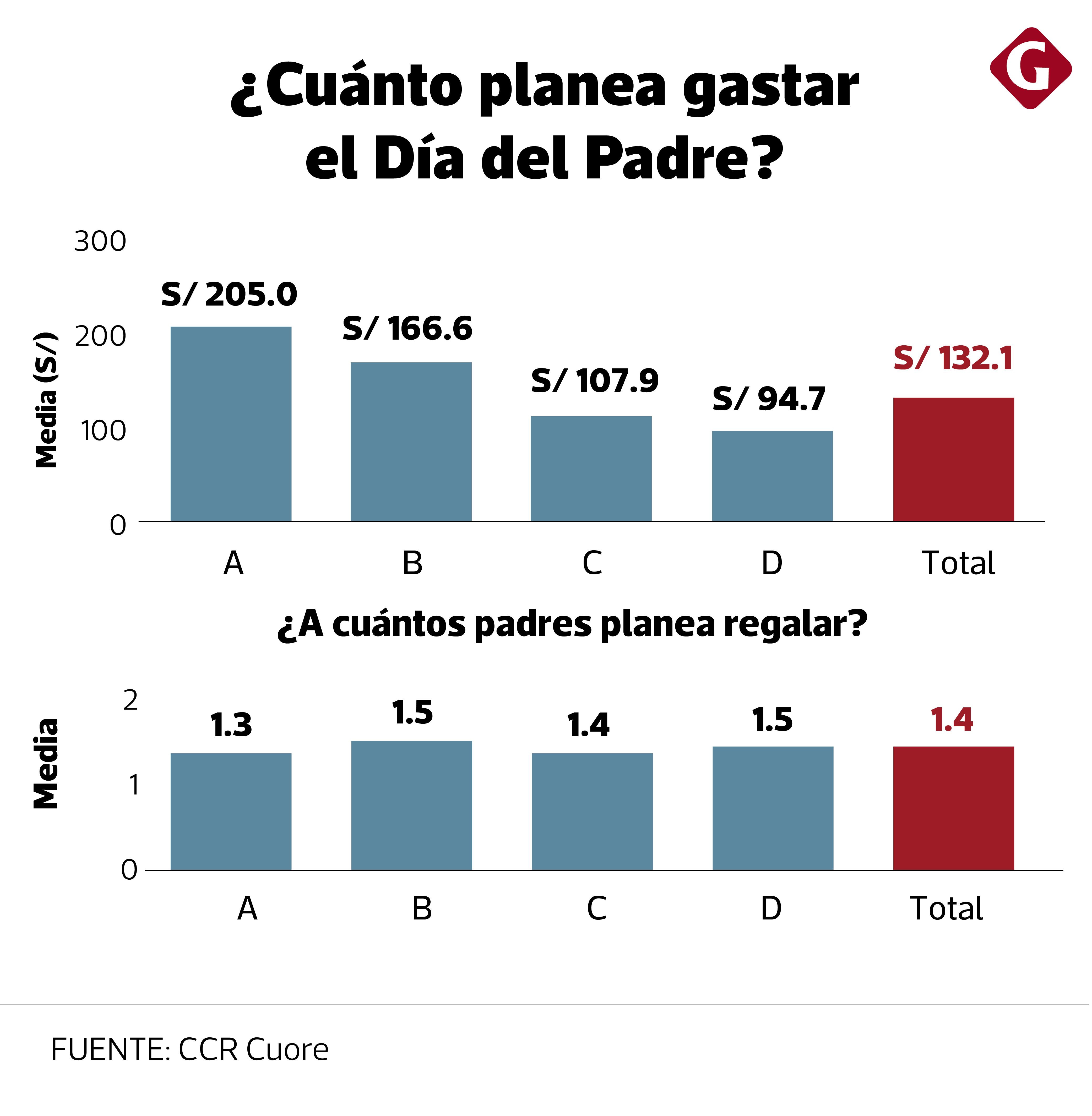 “Según el análisis del año pasado de la CCL, el gasto promedio estaba entre S/200 y S/250. Ahora, el que este ticket sea de S/ 132 (incluso por debajo del Día de la Madre de S/ 180) se podría deber a la contracción de la economía o también a que es la campaña del Día de la Madre la más grande”, manifestó Milagros Rentería, directora de Operaciones de CCR Cuore.