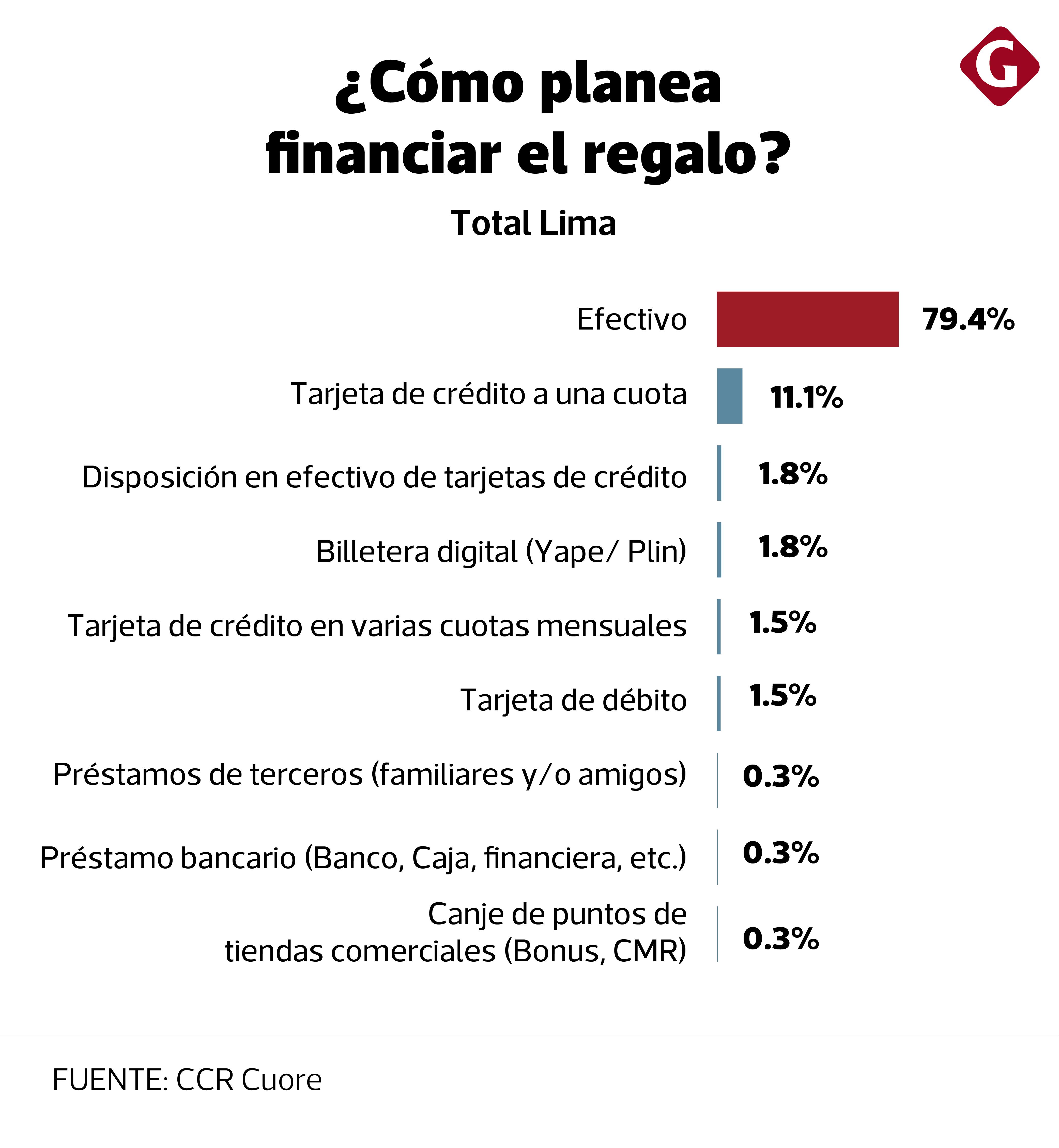 Asimismo, en torno a cómo cubrirán estos regalos, un 79.4% de encuestados afirma que lo realizará con efectivo, siendo solo un 13% el que dijo que tendrá que recurrir a tarjetas de crédito o disposición de efectivo. “El gasto en tarjetas para compras por el Día del Padre es bajo y eso también es posible porque el monto que se estima gastar no es muy grande”, agregó.