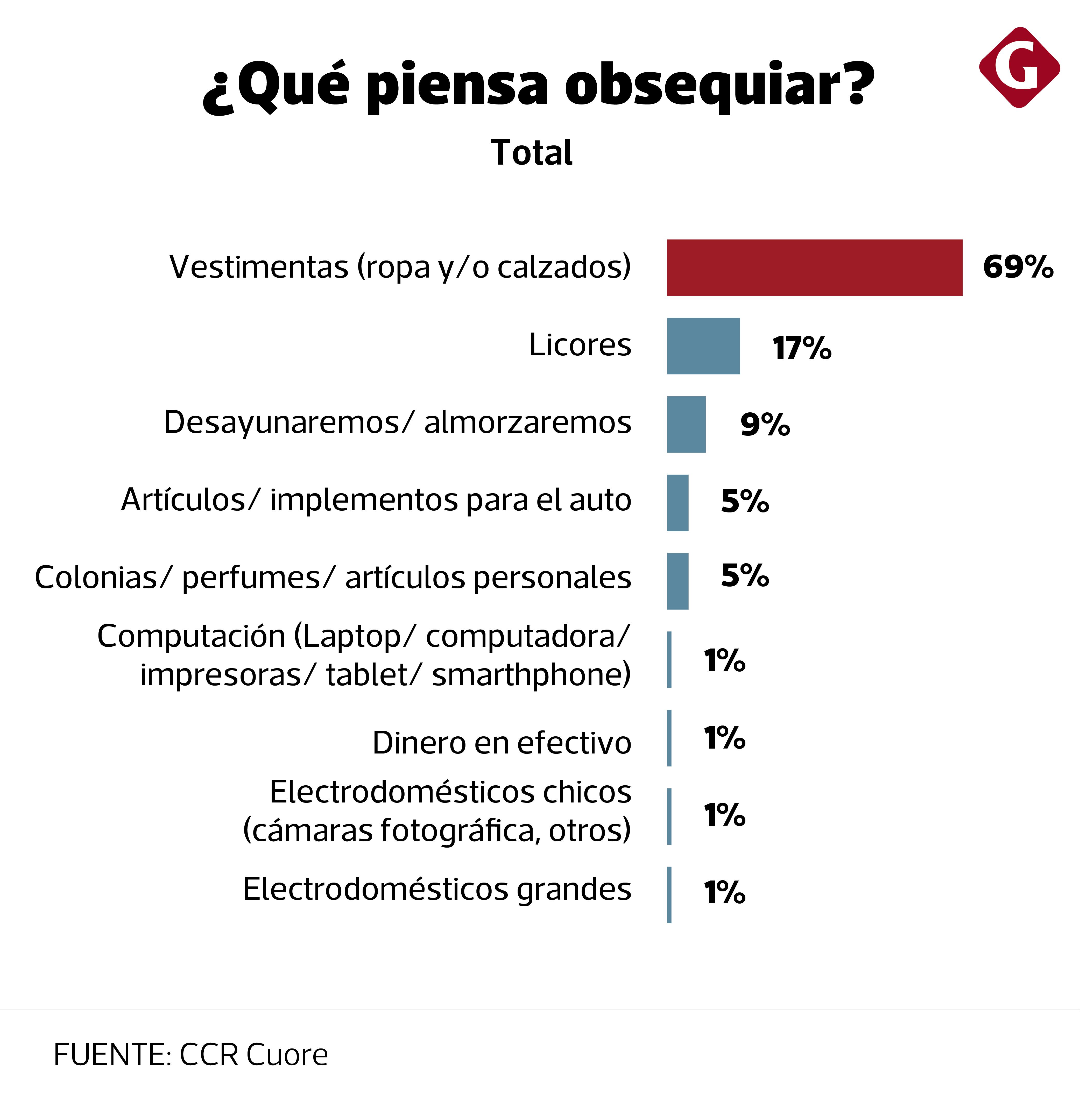 En el ranking de lo más regalado, el reporte de CCR Cuore evidencia que es la ropa o calzado con un 69% lo que más buscan los limeños a la hora de dar un presente a su progenitor. Y como segunda opción — y bastante alejado del primero— aparecen las bebidas alcohólicas con un 17%. Por el contrario, categorías como tecnología y electrodomésticos figuran contraídas en las preferencias.