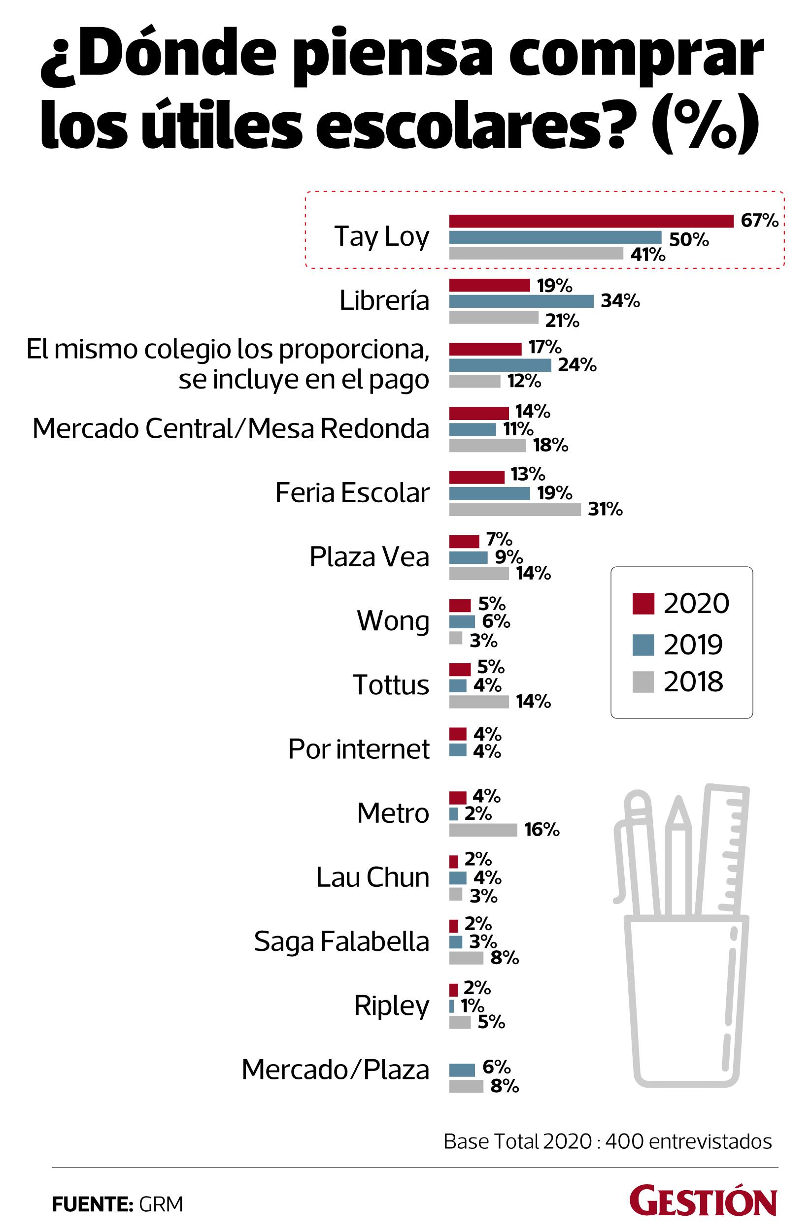 En la víspera se iniciaron las clases escolares en los colegios privados del país, por lo que cabe preguntarse, ¿Cuáles serán los lugares preferidos de compra de útiles escolares de los padres de familia? Según estudio de Global Research Marketing ( GRM), los progenitores de Lima de los segmentos A, B, y C, que tienen a sus vástagos en instituciones educativas privadas vienen prefiriendo el canal moderno al tradicional para la compra de los útiles escolares.