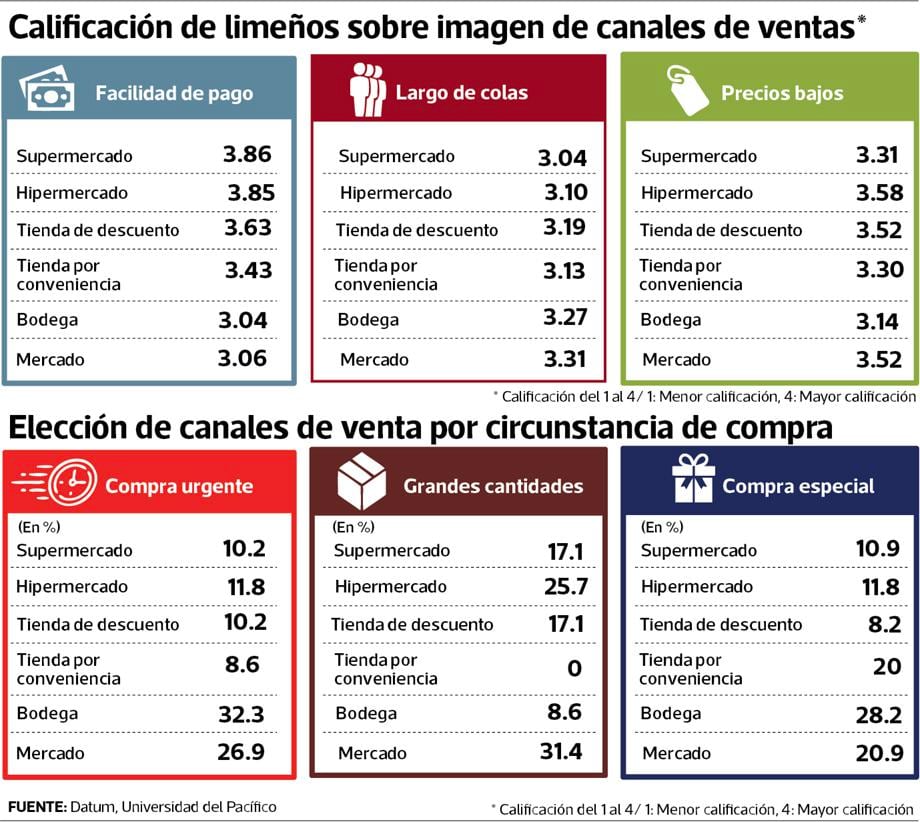 “Pero no solo el canal moderno (hipermercados, supermercados, tiendas de descuento) logra tener mejor imagen con respecto al canal tradicional en precios bajos, sino en otros aspectos, como amabilidad de los empleados y variedad de productos. Sin embargo, no logran capitalizarlo con mayor penetración o ventas”, comentó la gerente general de la consultora, Urpi Torrado.