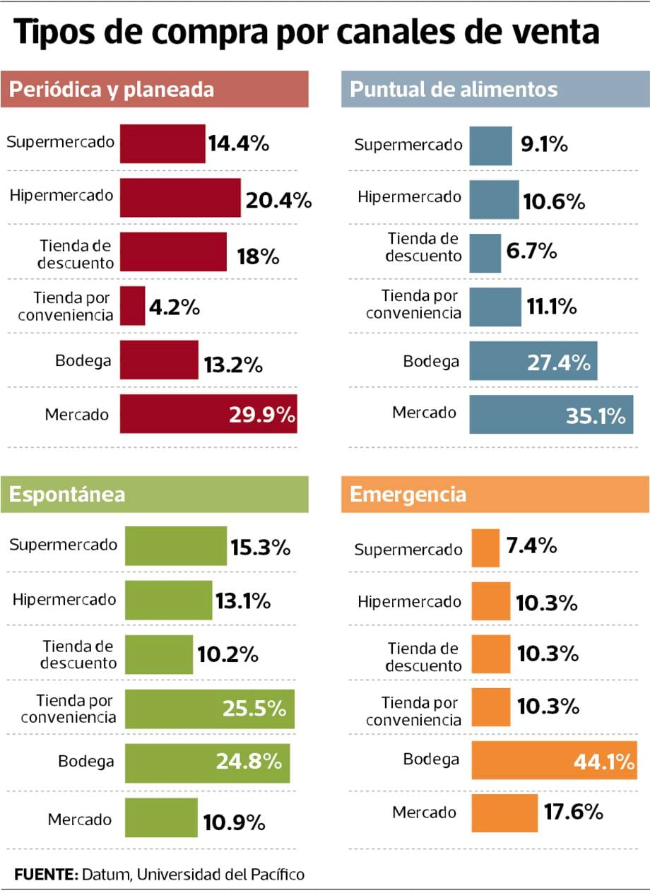 Asimismo, resaltó que si bien el 28% de limeños realiza compras periódicas y planeadas, las que realizan principalmente en supermercados, e hipermercados; aún le falta a estos canales atraer las compras de emergencia o puntuales de alimentos que se dan más en el canal tradicional.