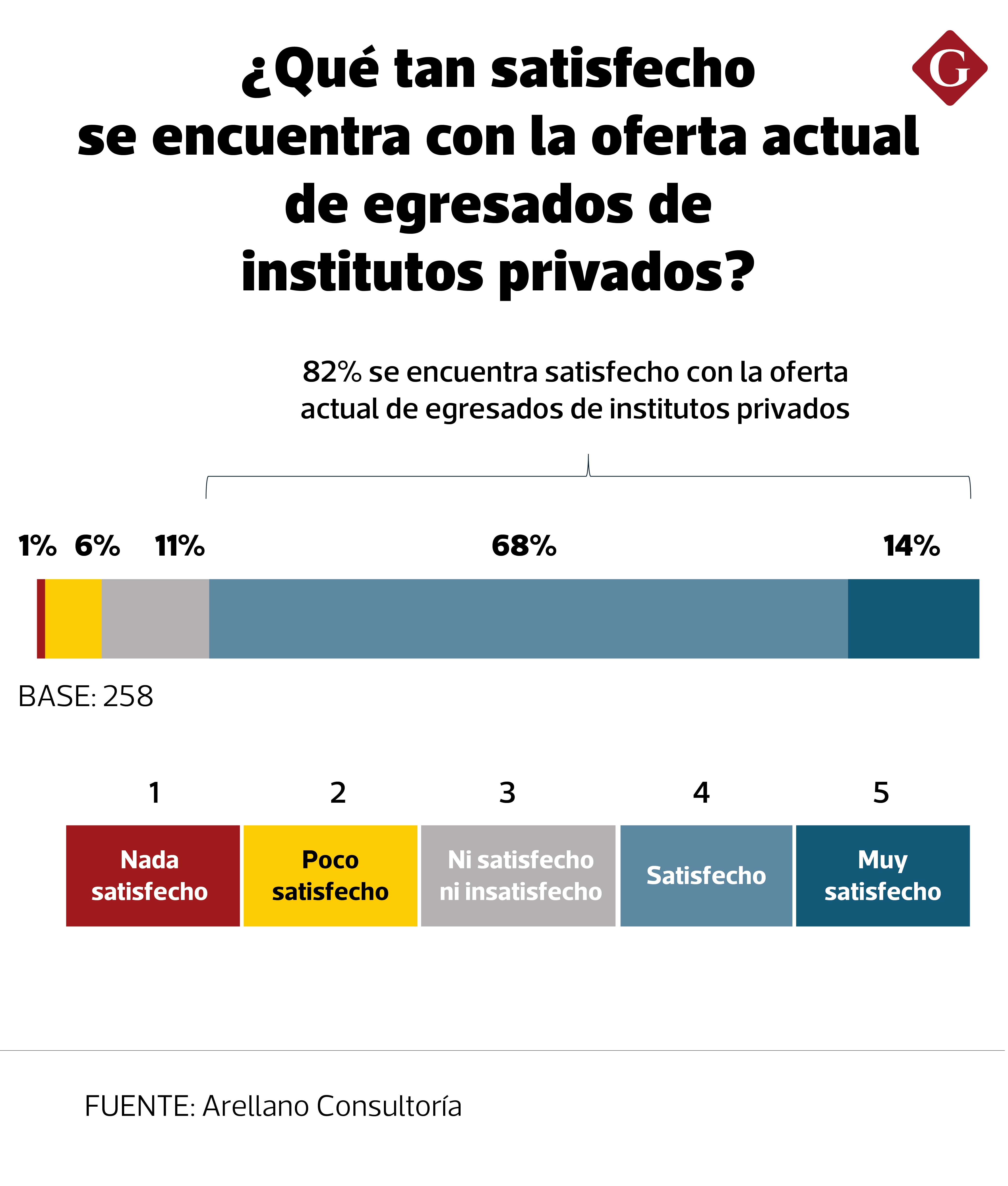 A partir de la oferta técnica existente en el mercado, 82% de los encuestados se encuentra entre “satisfecho y muy satisfecho” con los egresados técnicos de institutos privados, una cifra incluso por encima del 76% de empleadores conformes con los profesionales que culminaron estudios en universidades privadas.