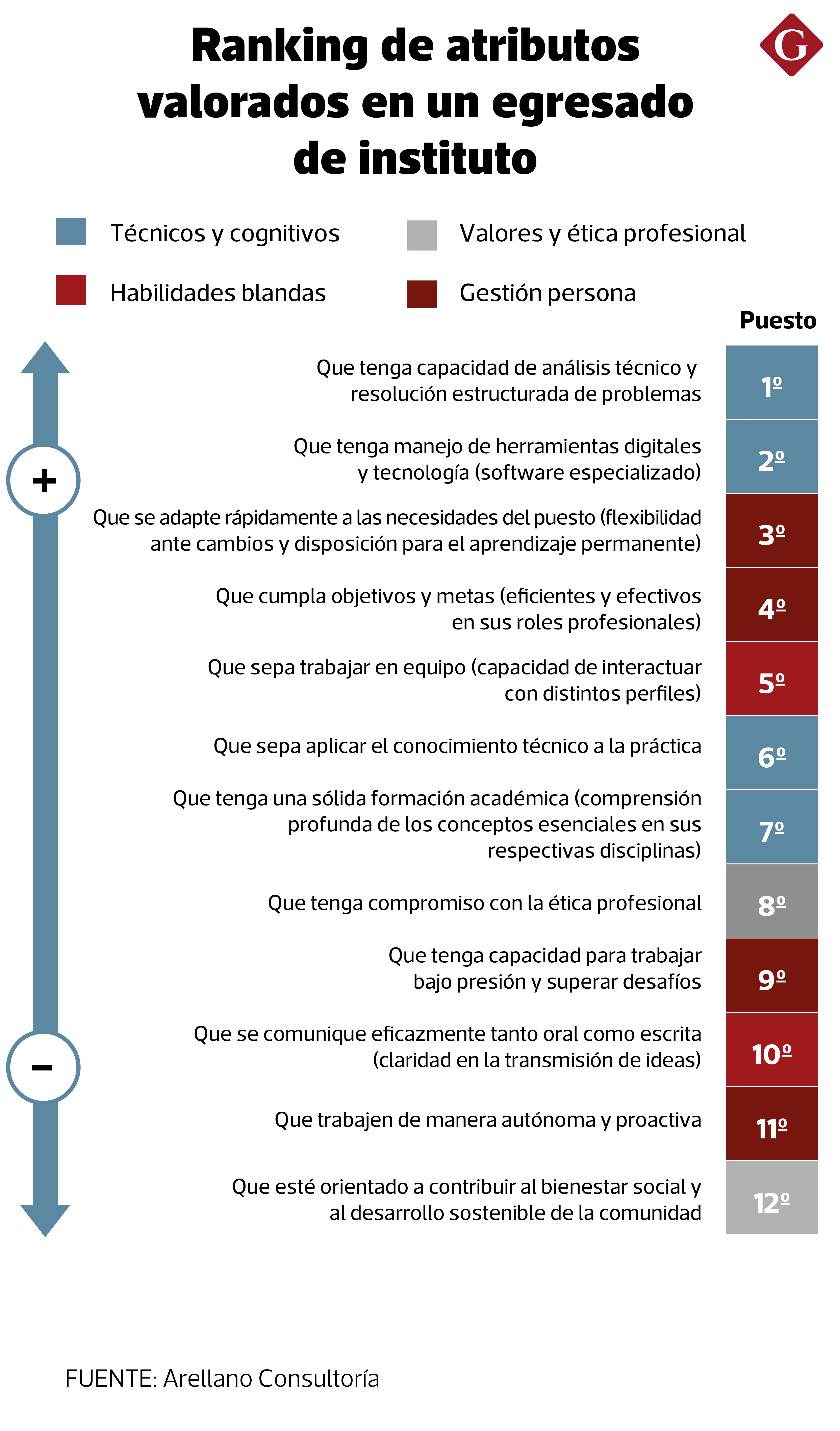 Dichos empleadores, en el análisis, destacaron como particularmente valioso que el egresado de un instituto cumpla con una serie de atributos, siendo prioridad la capacidad de análisis técnico y resolución estructurada de problemas, manejo de herramientas digitales y tecnología, adaptabilidad rápida a las necesidades del puesto, cumplimiento de objetivos y metas, trabajo en equipo, aplicación del conocimiento técnico a la práctica, sólida formación académica, entre otros. Aunque estas características deben ser un punto de partida en todos los profesionales técnicos, cobran mayor o menor relevancia según el sector de empresa.