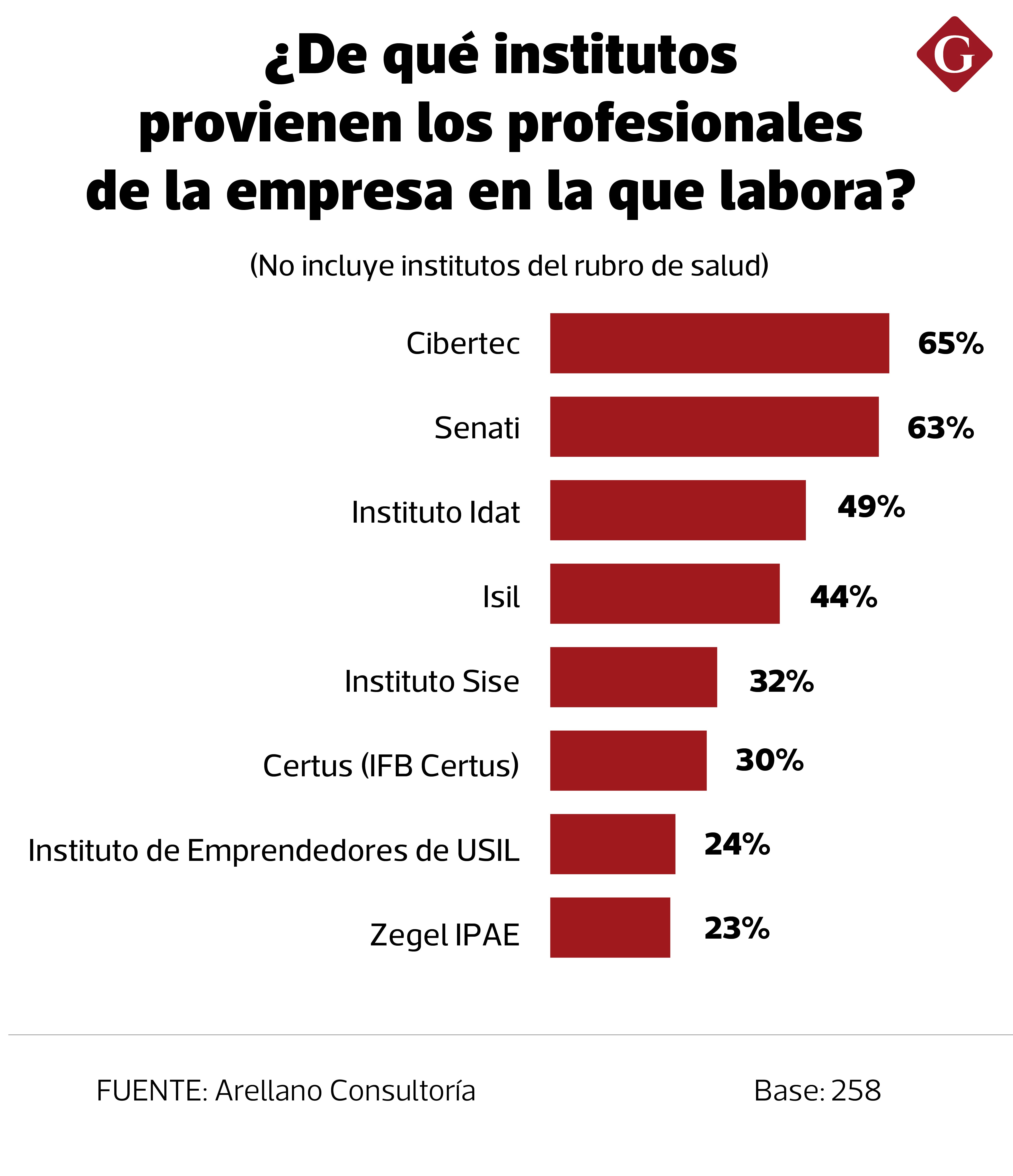 En torno a los institutos con mayor presencia de sus estudiantes en el ámbito laboral en Lima, los empleadores respondieron que, generalmente, los egresados técnicos que hoy laboran en sus empresas fueron formados en Cibertec (65%); Senati (63%); Instituto Idat (49%); Isil (44%), entre otros.