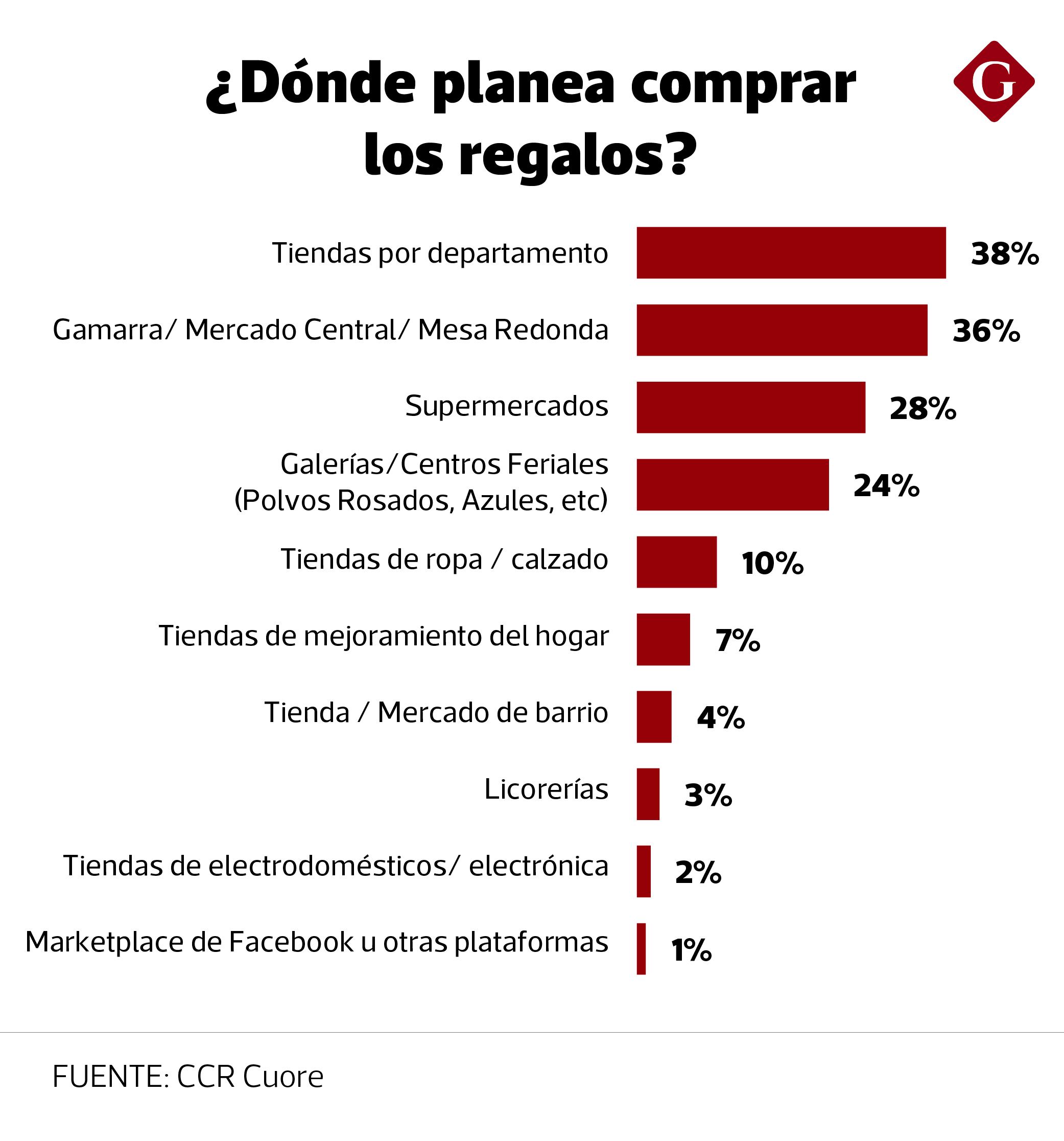 De acuerdo al estudio de Navidad, elaborado por CCR Cuore, son las tiendas por departamento (38%), así como Gamarra, Mercado Central y Mesa Redonda (36%) los lugares favoritos de los compradores para efectuar sus gastos. Así, son los niveles socioeconómicos A y B los que eligen las tiendas por departamento, mientras que el C y el D optan por las propuestas de establecimientos más populares.