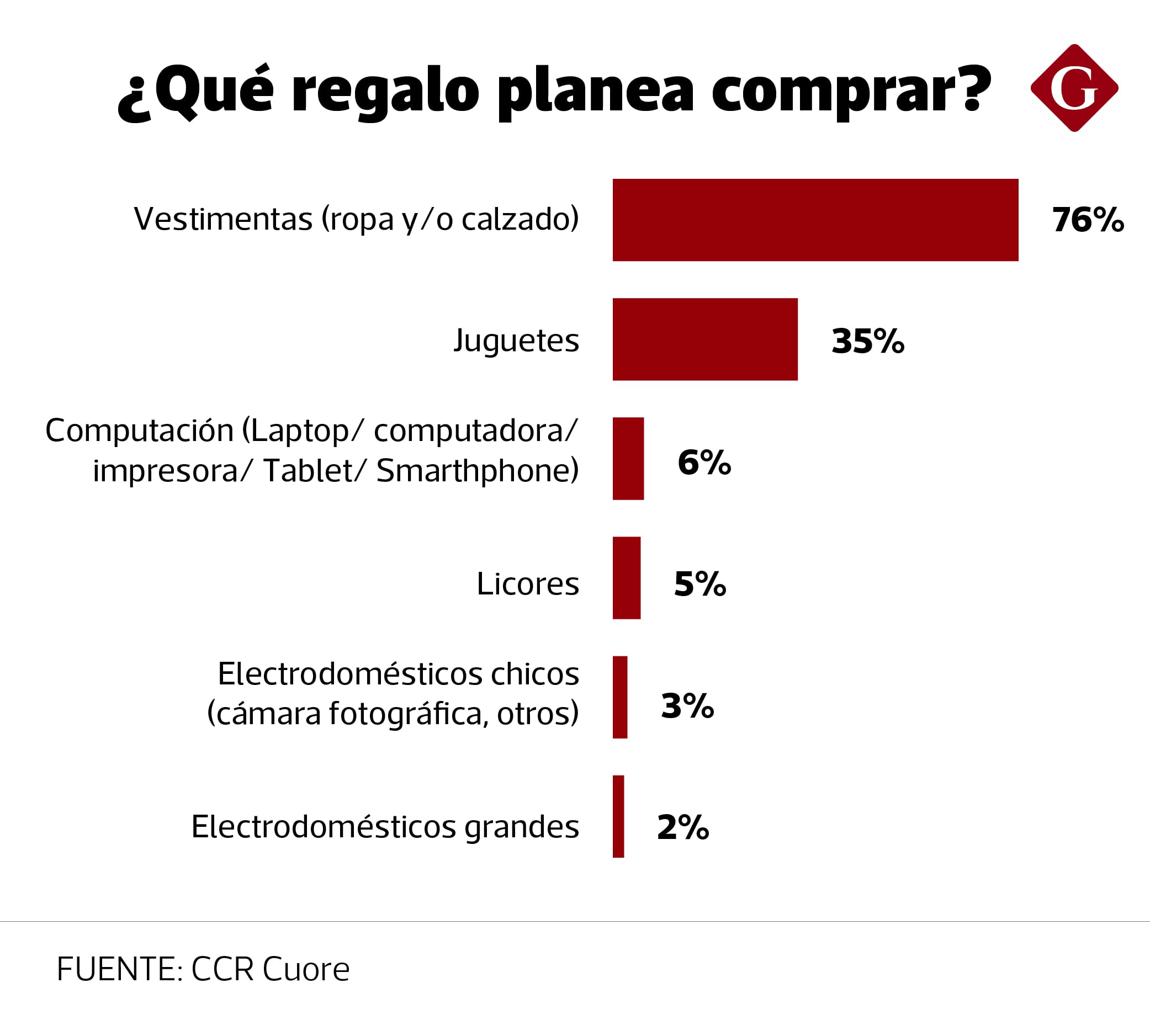 Según el informe de CCR Cuore; en promedio, un limeño compra regalos para dos personas, siendo la adquisición de vestimenta (ropa y calzado) transversal para todos los segmentos, a diferencia de juguetes que tiene un mayor nivel de adeptos entre el B y C, y equipos de computación (laptop, computadora, impresora, tablet o smartphone) que tiene más penetración en el sector A.
