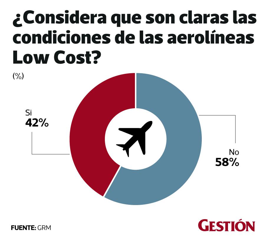 Sin embargo, para un 58% las condiciones de las aerolíneas low cost no están claras frente a un 42% que considera que las condiciones sí están claras. (Ver cuadro)
