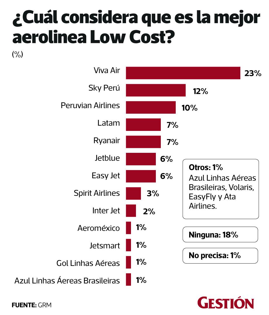 Dato: El 23% considera a Viva Air como la mejor aerolínea low cost; 12% a Sky; 10% a Peruvian Airlines y 7% a Latam. (Ver cuadro)