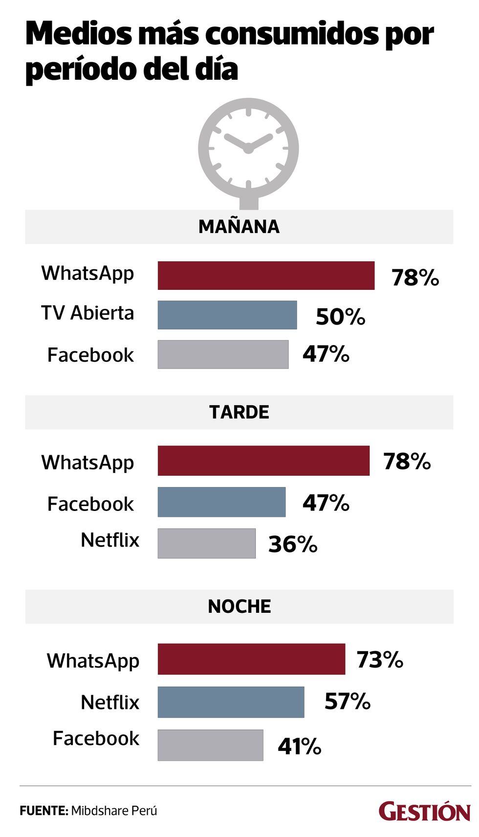 Sobre los medios o plataformas digitales que más utilizan durante los distintos momentos del día, el 78% señaló que en la mañana usa whatsap, 50% televisión abierta y 47% Facebook.