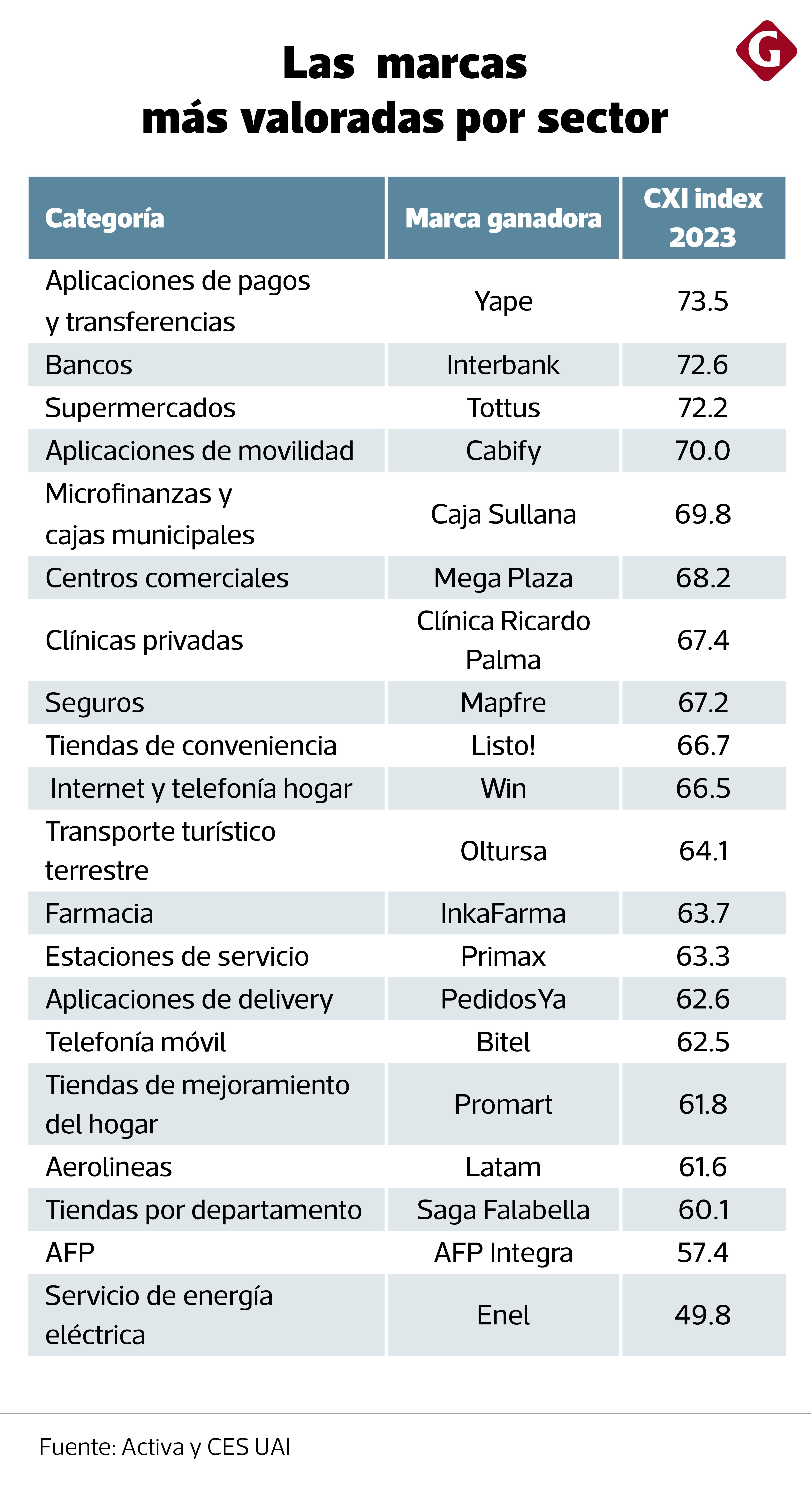 En la categoría banca lidera Interbank (72.6 puntos); en supermercados, Tottus (72.2); en aplicaciones de movilidad, Cabify (70 puntos); y en microfinanzas y cajas municipales, Caja Sullana (69.8 puntos).