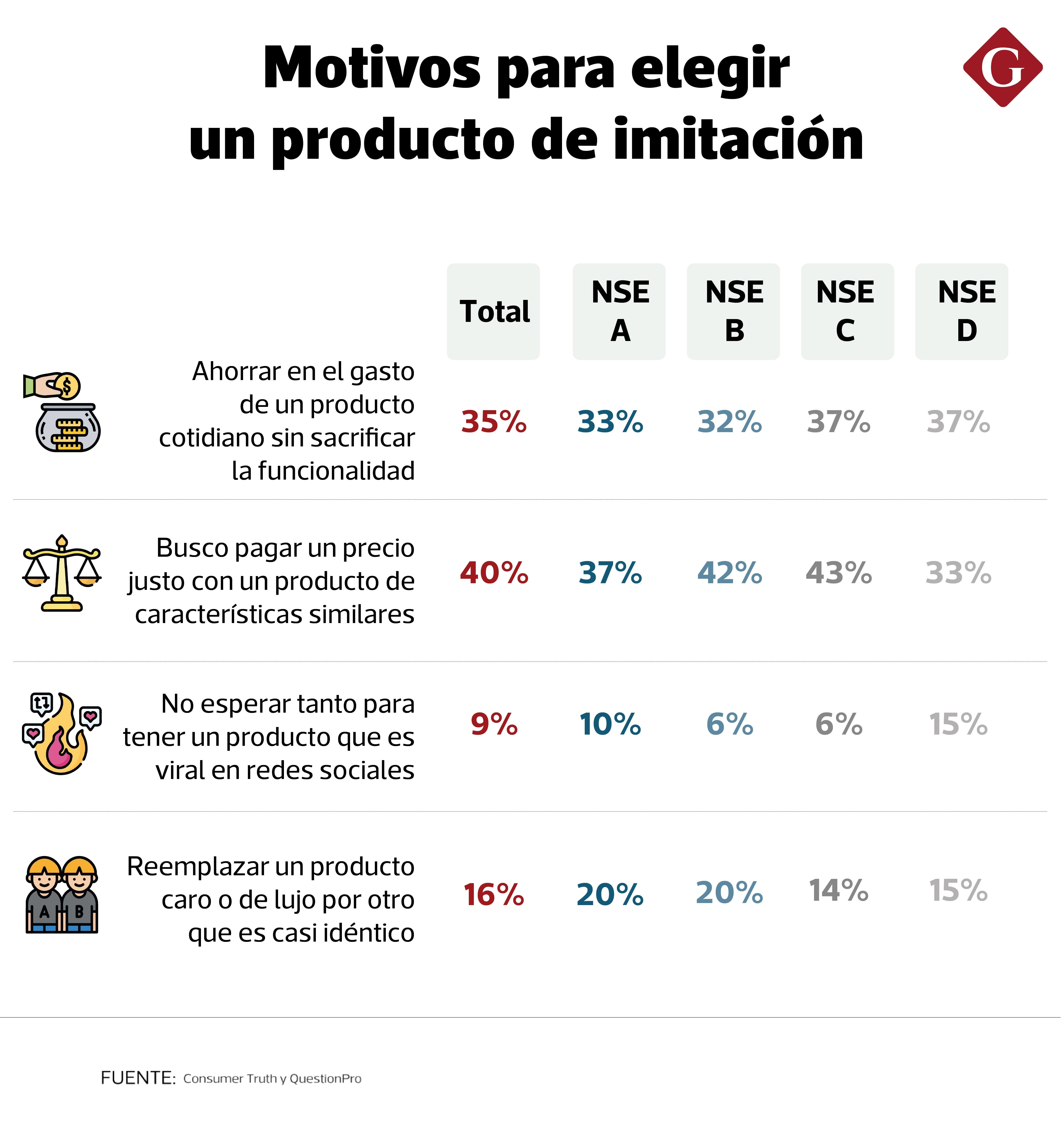 La ejecutiva indicó que la elección de un producto de imitación tiene como principales motivaciones el pago de un precio justo por un producto de características similares a uno tradicional o de lujo (40%); ahorrar en el gasto de un producto cotidiano sin sacrificar la funcionalidad (36%); reemplazar un producto caro o de lujo por otro que es casi idéntico (16%) y no esperar tanto para tener un producto que es viral en redes sociales (9%). Estos propósitos están estrechamente vinculados a la manera cómo los actuales consumidores, principalmente, generación X, millennials y centennials, conciben sus relaciones con las marcas.