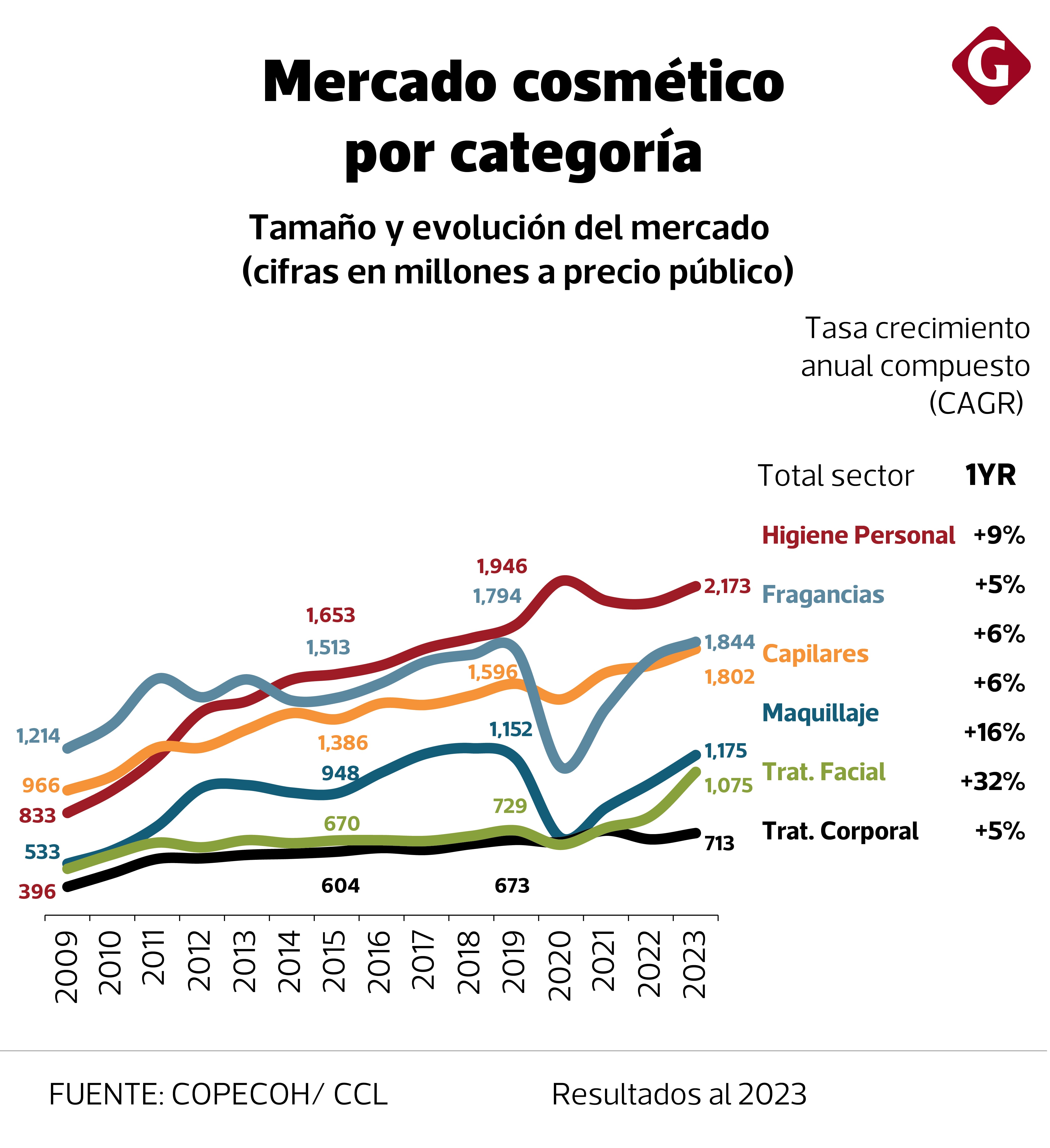 Según el reporte de Copecoh, tratamiento facial fue la categoría que más creció (32 %) el 2023 en relación a 2022, apalancado por cinco factores claves como nuevos hábitos del consumo, uso de ingredientes innovadores, desarrollo de productos nuevos, respaldo de nuevos canales y crecimiento del mercado de dermocosmética.