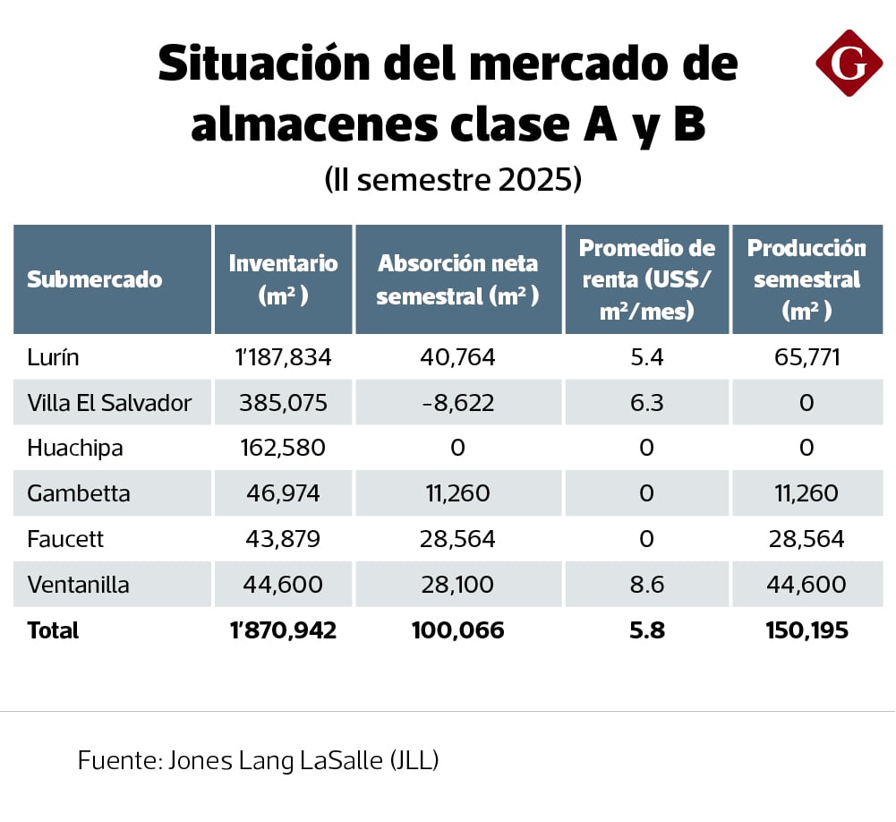 A partir de una colocación de cerca de 140,000 metros cuadrados (m2) y una nueva producción de alrededor de 160,000 m2, el mercado de almacenes clase A y B mantuvo su expansión en el 2025, proyectando que dicho comportamiento positivo continúe este 2026 y se acentúe incluso en el 2027. De acuerdo al reporte logístico, elaborado por Jones Lang LaSalle(JLL), el futuro auspicioso para este sector tiene como importantes protagonistas a nuevos operadores que aterrizarán en el mercado; además, de la creación de dos nuevas zonas.