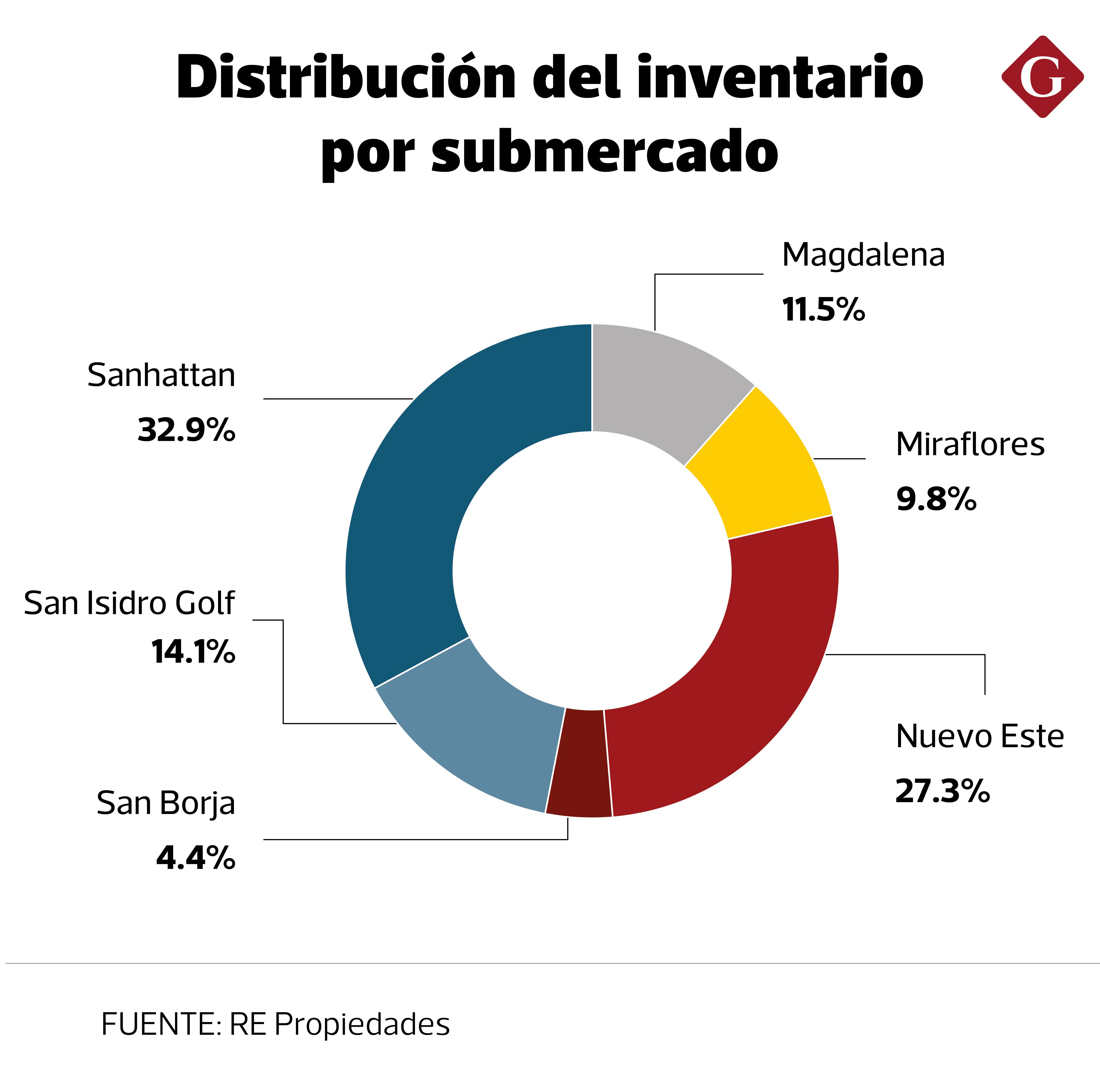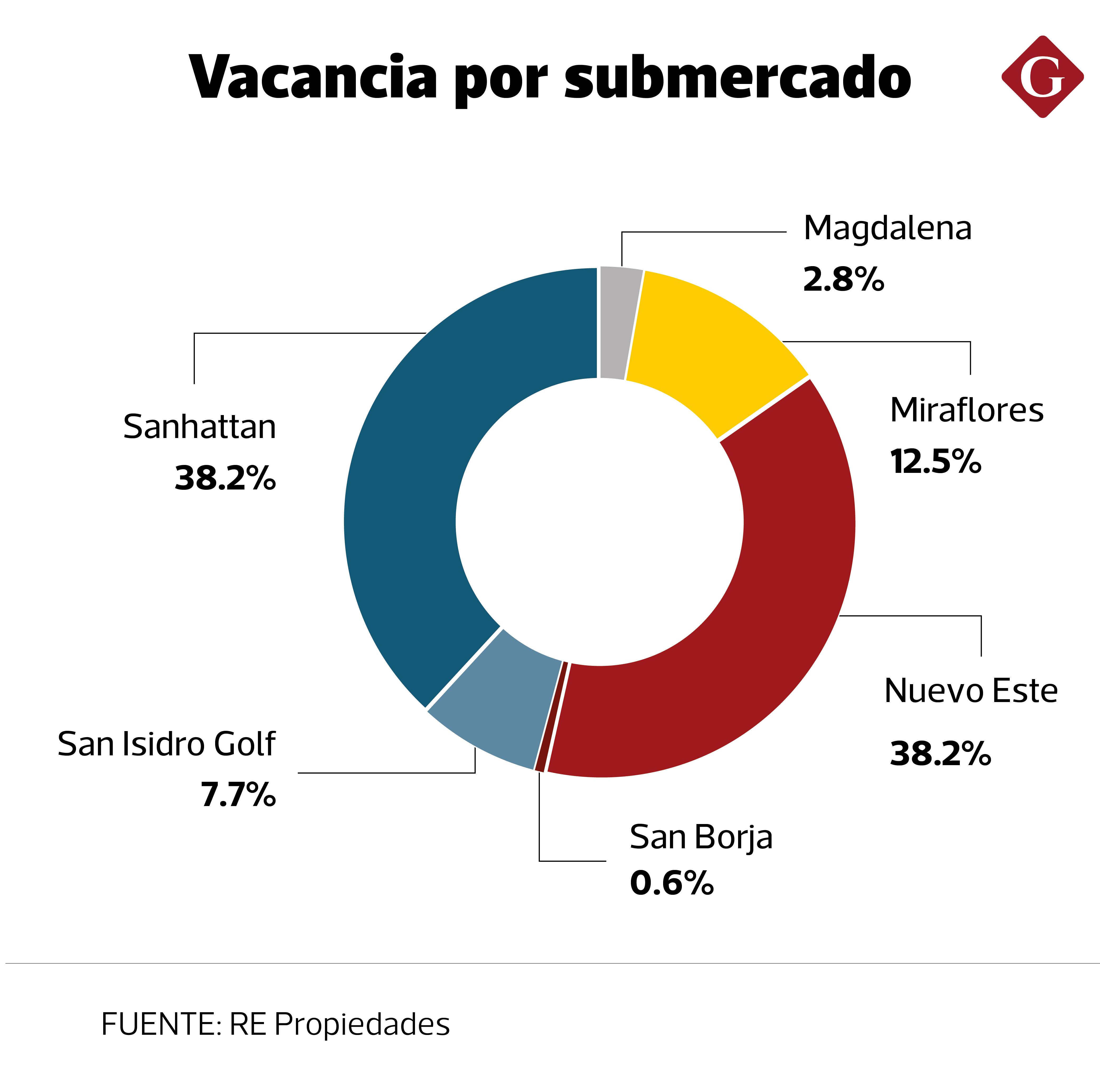 En la actualidad, de estos tres submercados; Sanhattan representa el 38.2% de la vacancia total, Miraflores un 12.5% de la disponibilidad y San Isidro Golf el 7.7%. “Sanhattan tiene una vacancia elevada porque su inventario también es grande, con una participación del 32.9% del registro total; al igual que el submercado Nuevo Este que tiene el 38.2% de la vacancia y el 27.3% del inventario”, detalló el ejecutivo.