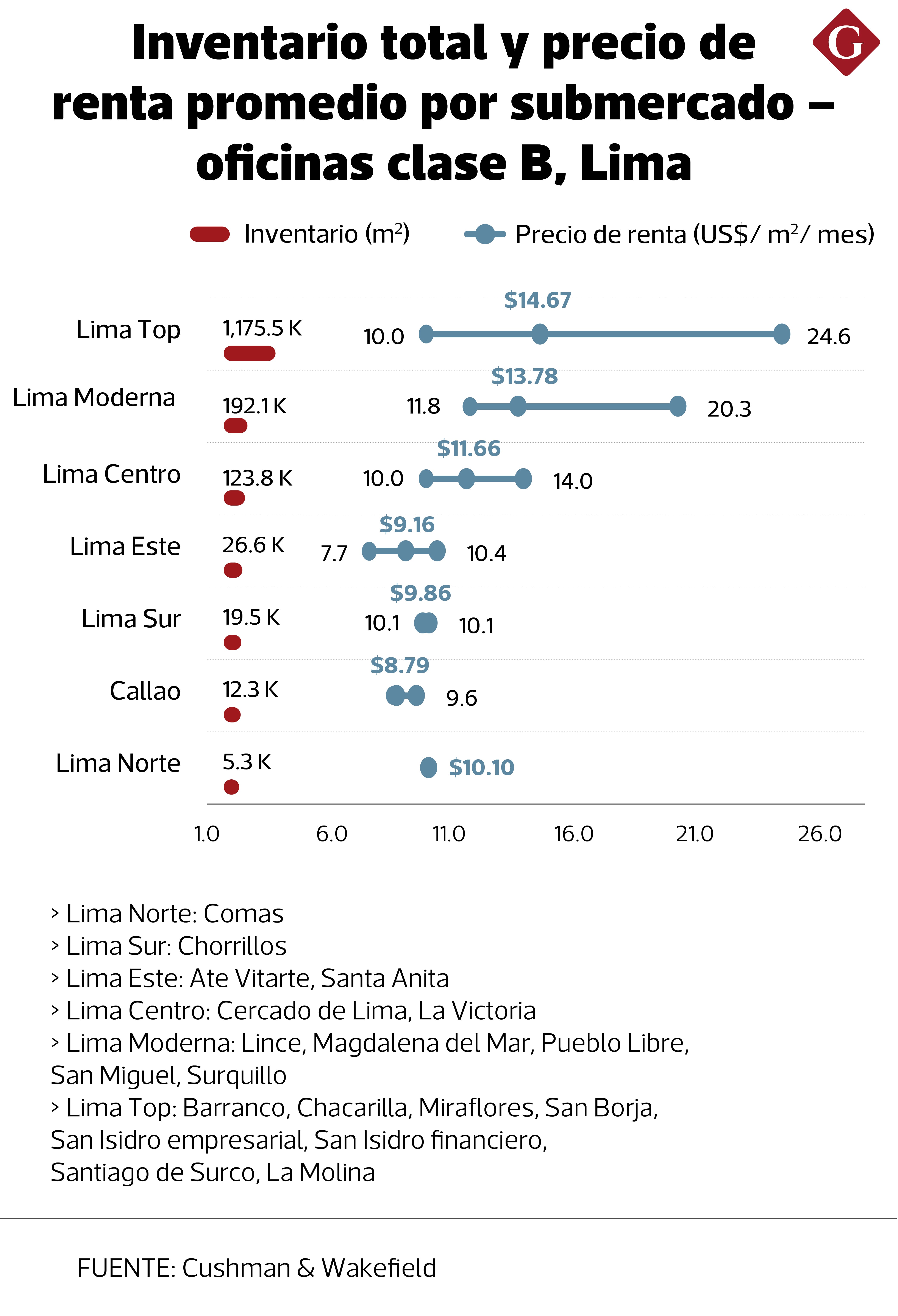 En Clase A, en cambio, los nuevos proyectos llegarán recién en el 2027 y lo harán con precios por encima de los US$ 20 por m². Antes de tal escenario, la renta promedio podría ubicarse entre US$ 17 y US$ 18 por m², de manera progresiva.