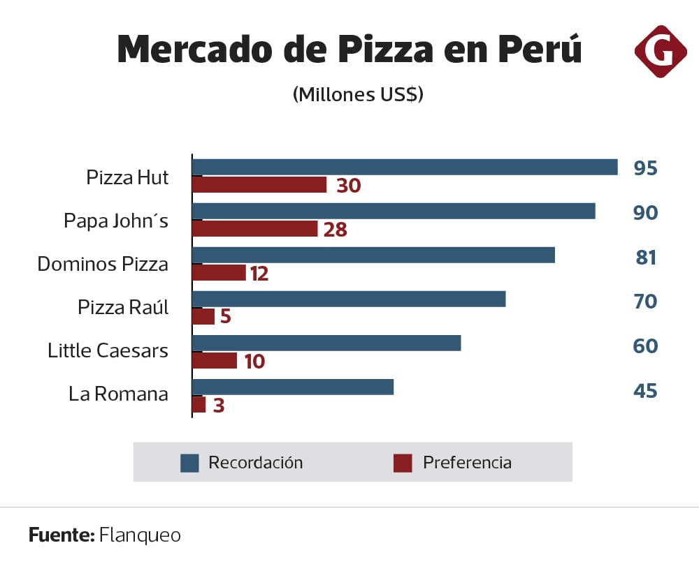 Posicionamiento. Pizza Hut tiene un 95% de recordación, mientras que Papa Johns y Domino’s Pizza tienen un 90% y 81%, respectivamente. Siguen en la lista Pizza Raúl (70%), Little Caesars (60%) y La Romana (45%).