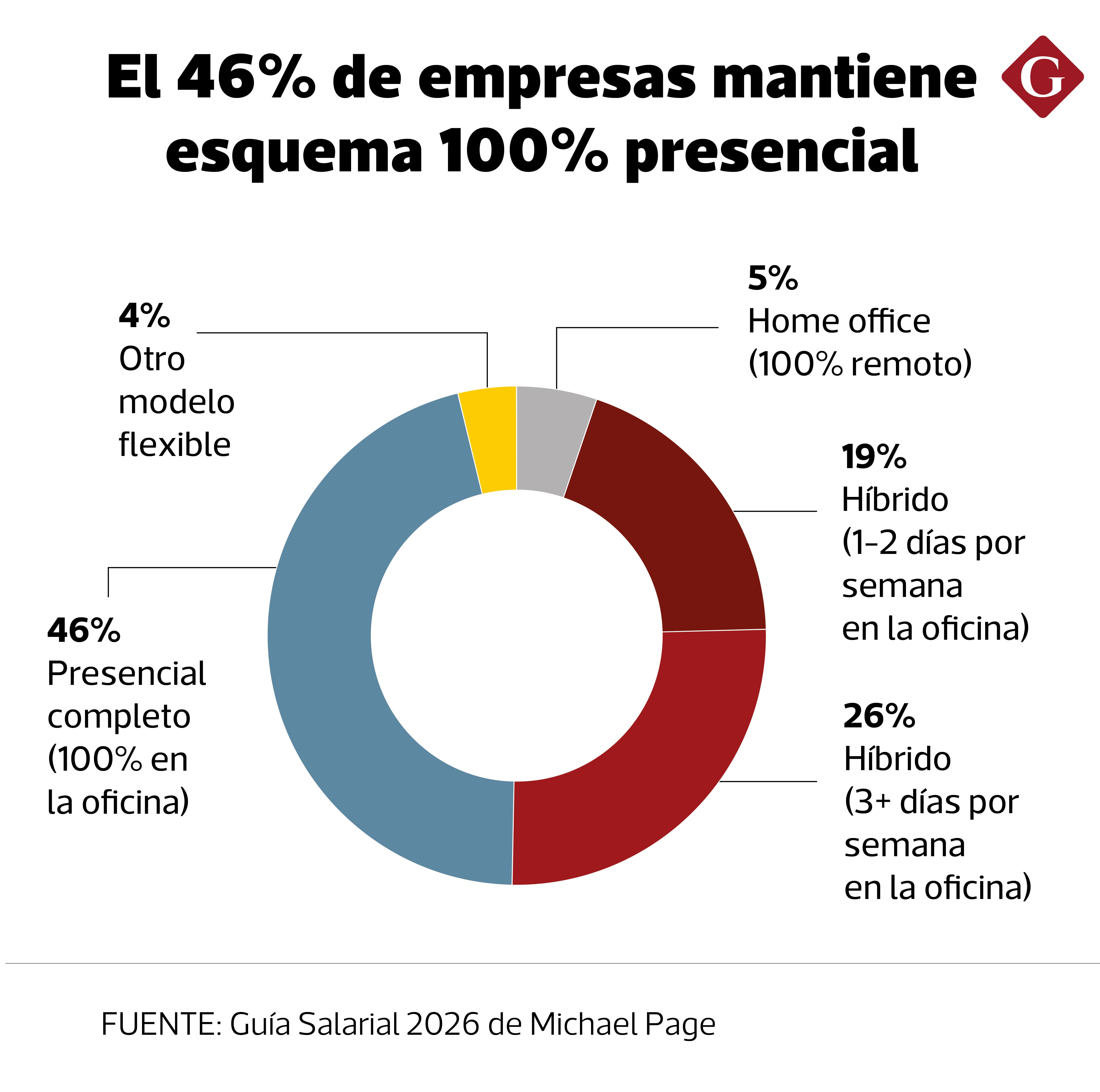 Uno de los puntos de mayor fricción es la modalidad de trabajo. Aunque muchos profesionales buscan mayor flexibilidad o trabajo remoto, la presencialidad continúa predominando en el mercado laboral peruano. Según el estudio, el 46% de las empresas exige trabajo 100% presencial. En contraste, alrededor del 26% opera bajo esquemas híbridos de tres o cuatro días en oficina, el 19% aplica modelos híbridos con uno o dos días presenciales, el 5% funciona completamente en remoto y el 4% cuenta con otros esquemas flexibles.