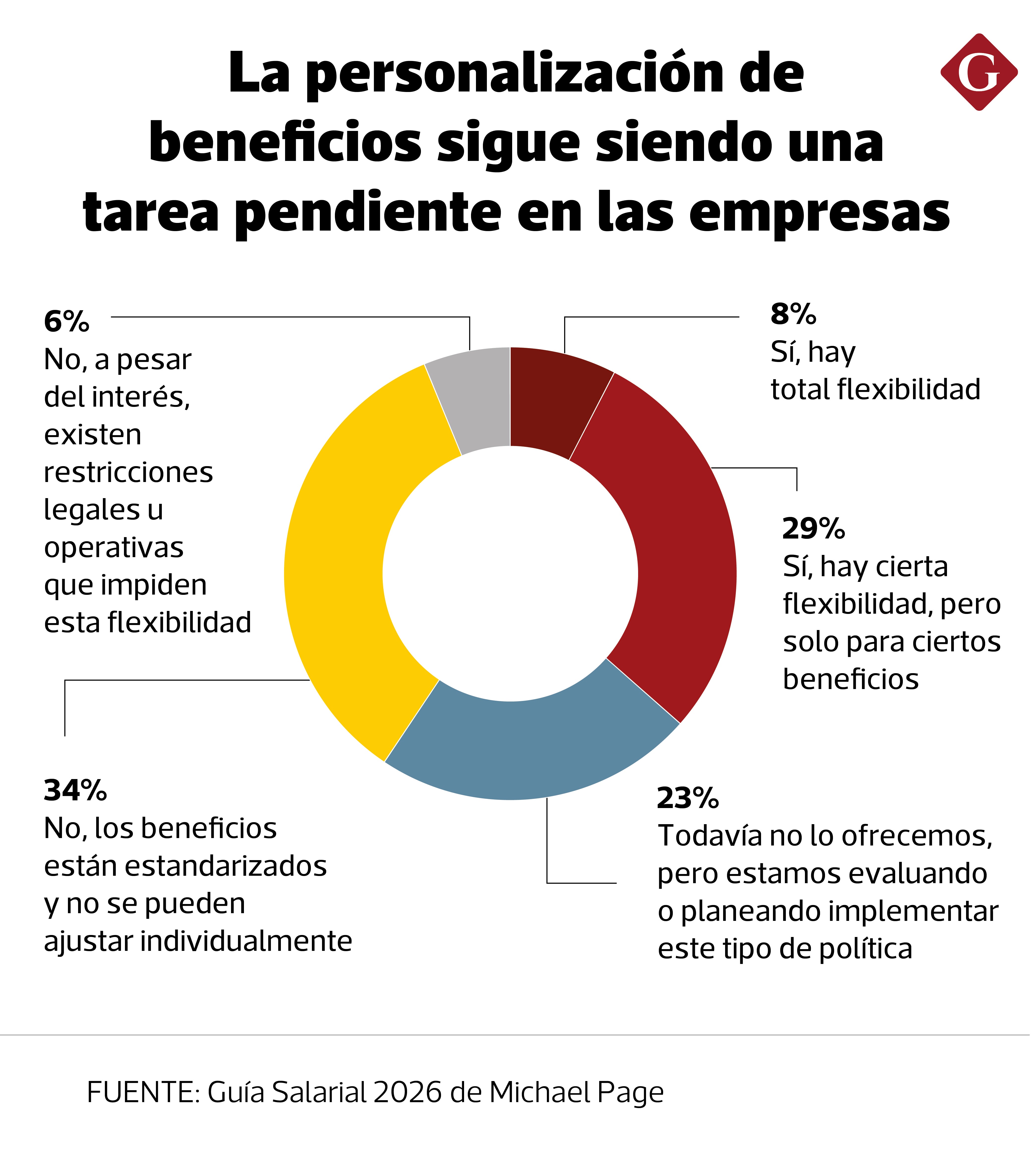 Así, a pesar del avance de los modelos híbridos y remotos, muchas organizaciones todavía no han ajustado sus políticas de beneficios. De acuerdo con la Guía Salarial 2026, el 63.4% de las empresas en Perú señala que no ha realizado cambios en su oferta de beneficios, pese a las nuevas dinámicas laborales.