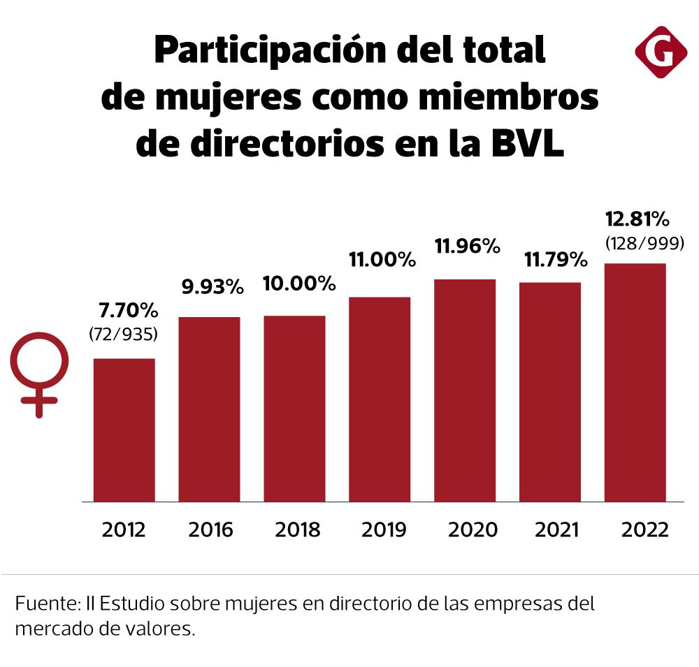 Entre los 999 directores de las 218 empresas de la Bolsa de Valores de Lima, solo 128 (es decir el 12.81%) son mujeres, según cifras del 2022. Estos datos revelan un avance de apenas 1.02 puntos porcentuales con respecto al año anterior (11.79%) y de 5.11 puntos porcentuales con respecto al resultado de 10 años atrás (7.7%).