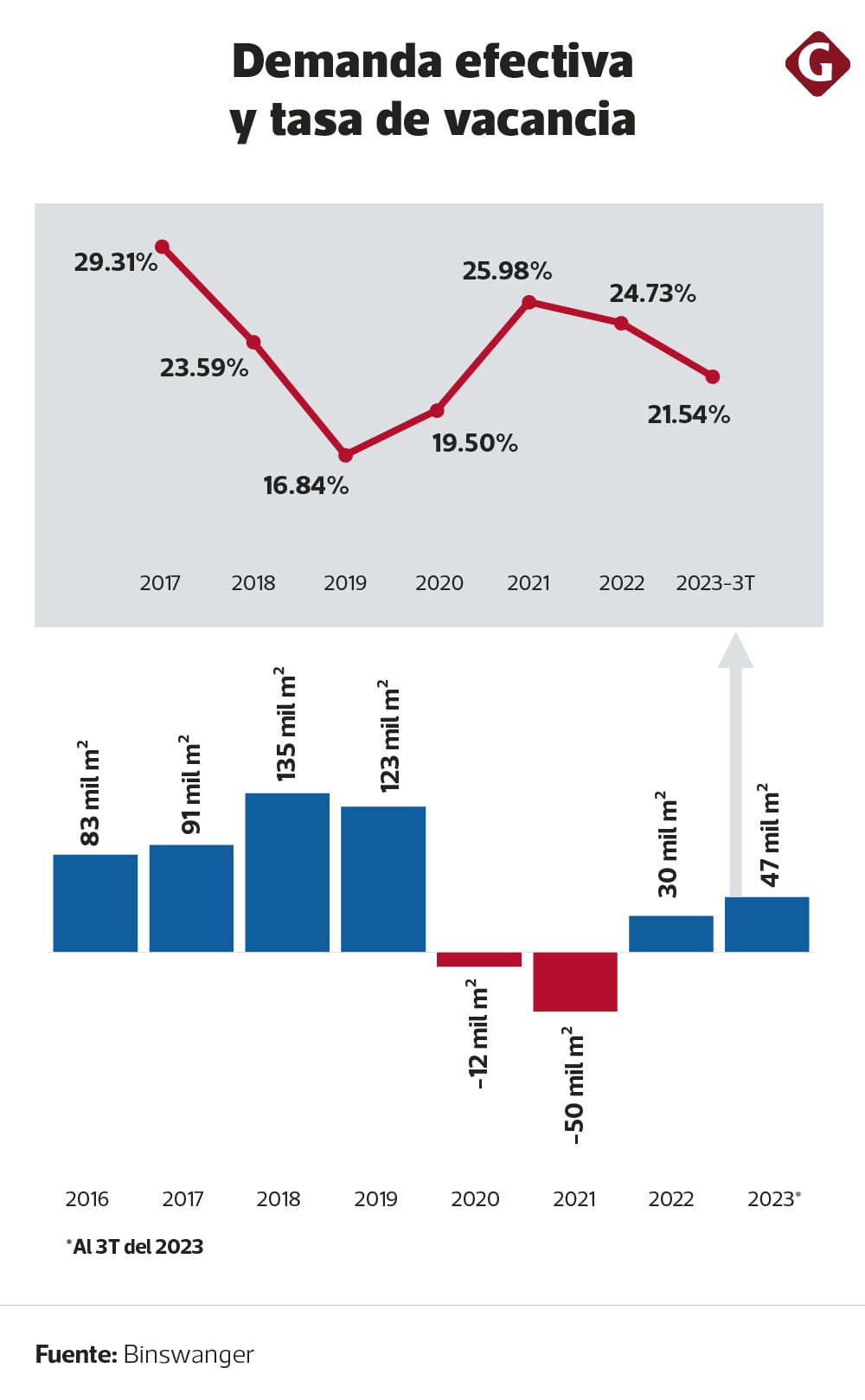 La tasa de vacancia promedio se redujo en tres puntos porcentuales hasta alcanzar 21.54%. “Para el cierre del año esperamos que la demanda efectiva llegue a los 60,000 metros cuadrados, con lo cual la tasa de vacancia llegaría a 20%, cuatro puntos por debajo del 2022. Una vacancia saludable es de 15%″, afirmó el ejecutivo.