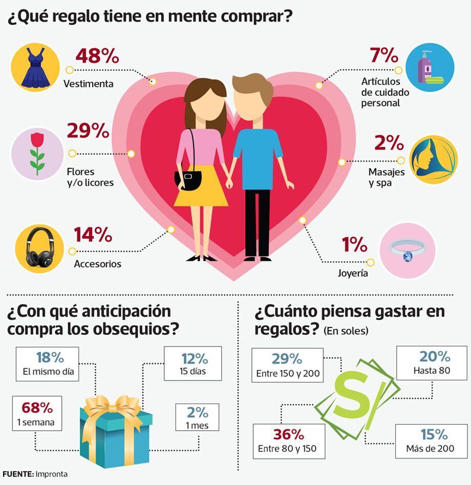 Según cifras de Impronta, los limeños gastan, en promedio, por San Valentín alrededor de S/ 143.5. “En esta época hay mayor presión sobre los consumidores hombres, se espera más de ellos y son los consumidores que más invierten”, comentó Oropeza.