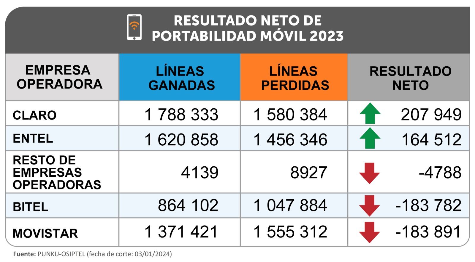 En el 2023, Claro y Entel fueron las empresas operadoras que obtuvieron los mayores resultados netos (es decir, la diferencia entre líneas ganadas y perdidas) positivos con 207,949 y 164,512 líneas móviles a favor, respectivamente.